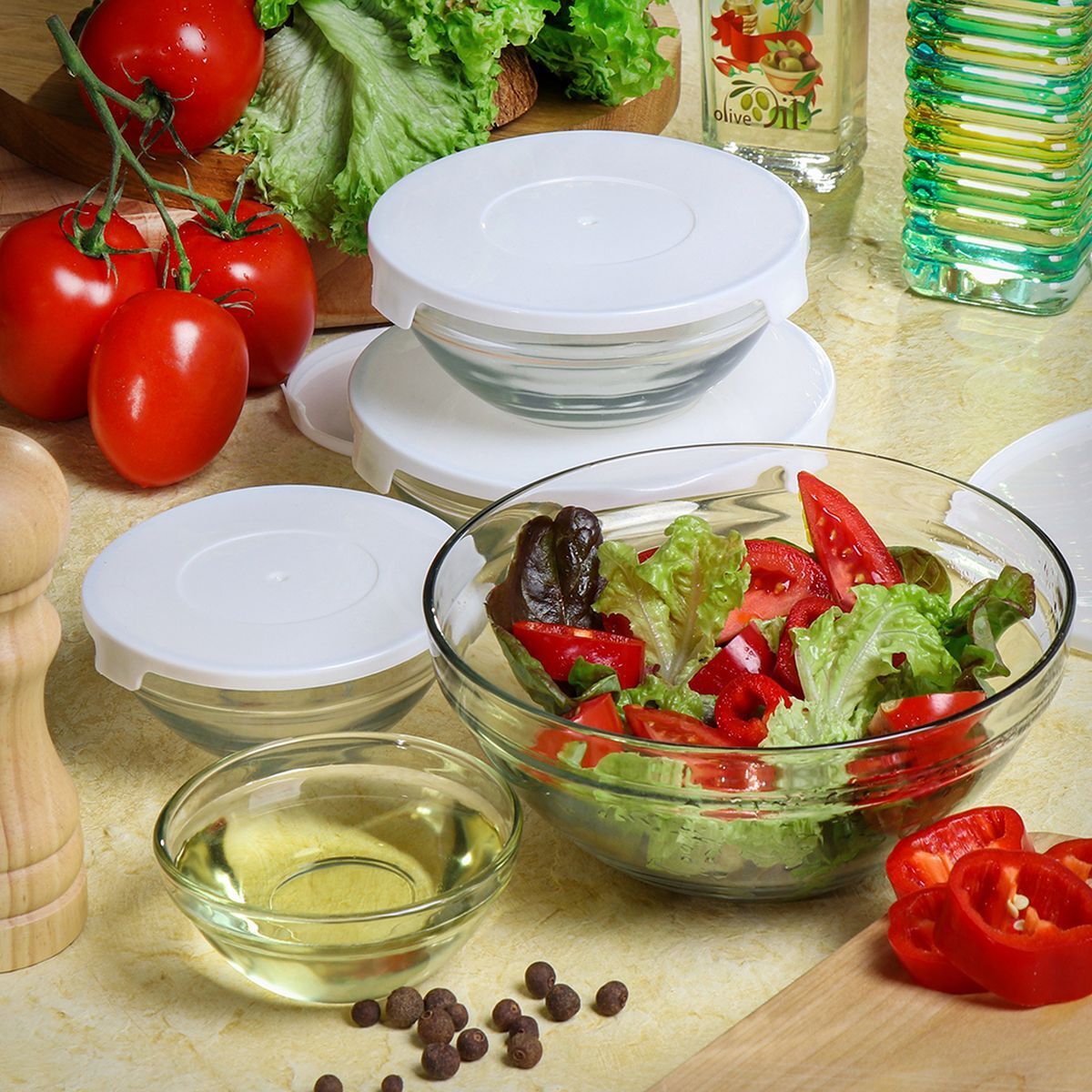 Набор салатниц выполнен из качественного прочного стекла и включает в себя 5 круглых салатниц различного диаметра. Изделия сочетают в себе яркий дизайн с максимальной функциональностью. Цветные пластиковые крышки плотно закрываются, за счет чего приготовленные блюда будут храниться дольше. Такой набор пригодится любой хозяйке, значительно облегчив ее работу, а также добавит уюта любому праздничному столу! Посуда обладает гладкой непористой поверхностью, не впитывает запахи, устойчива к перепадам температуры.