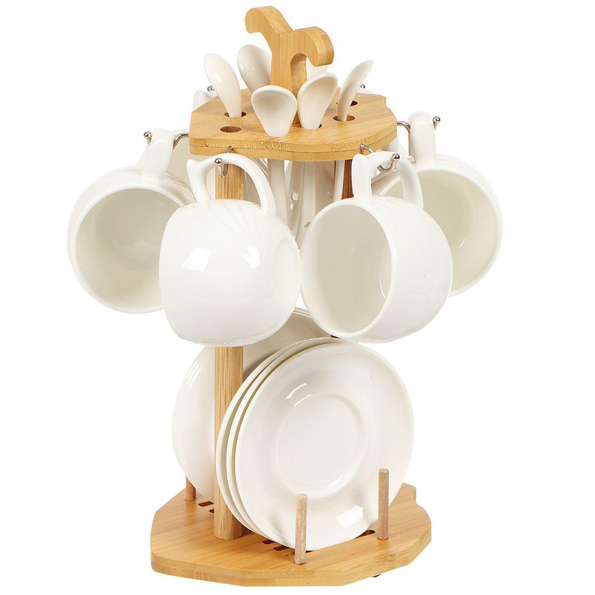 Набор состоит из 6 кружек и блюдец с ложками и подставкой. Кружки изготовлены из глазурованной керамики. Теплостойкие ручки обеспечивают комфортное использование. Кружки подходят для горячих и холодных напитков. Изящный дизайн придется по вкусу и ценителям классики, и тем, кто предпочитает современный стиль. Он настроит на позитивный лад и подарит хорошее настроение с самого утра. Изделия можно компактно хранить на подставке, входящей в набор. Оригинальная деревянная подставка станет стильным украшением любого интерьера. Выполненное из экологичного материала изделие отвечает последним интерьерным тенденциям.
