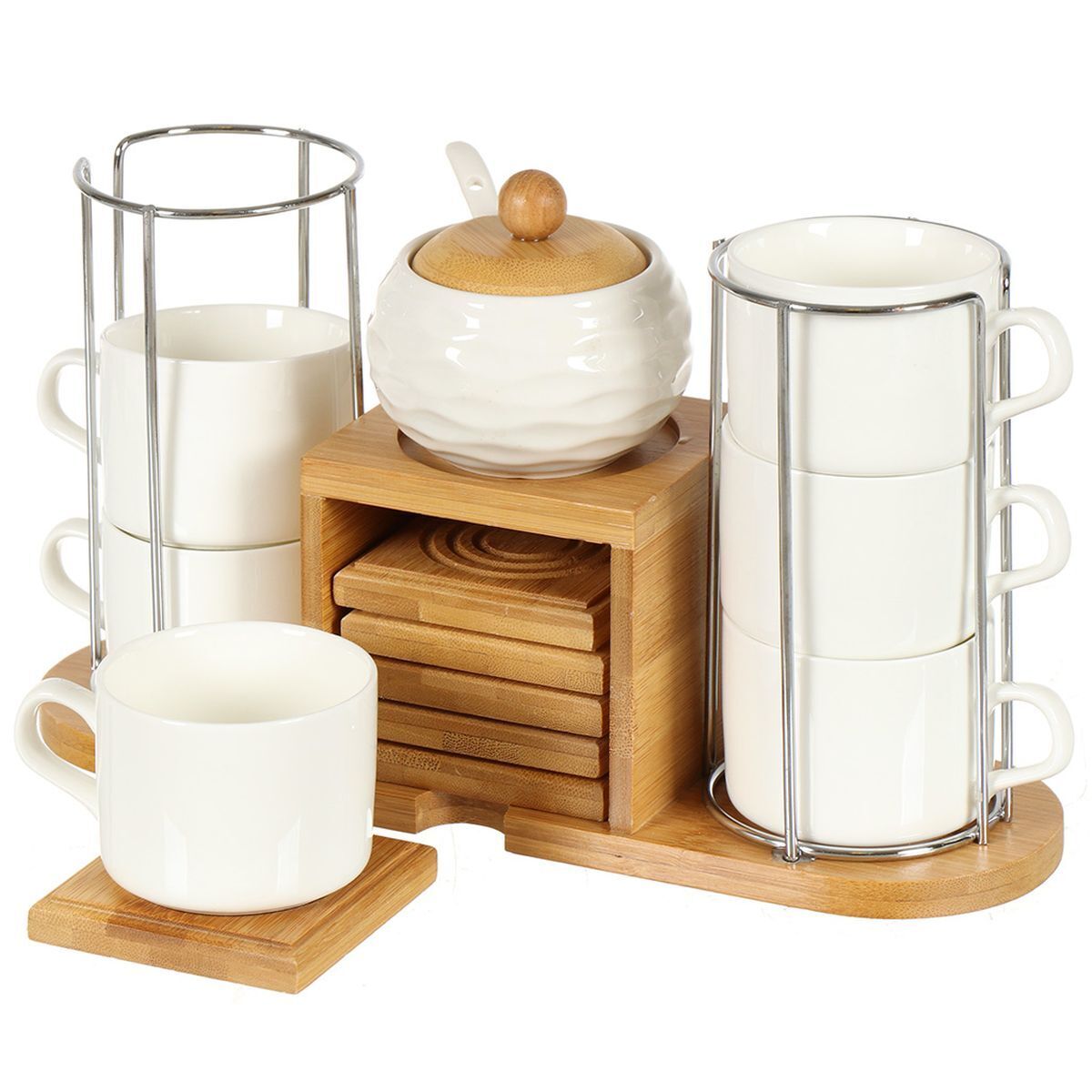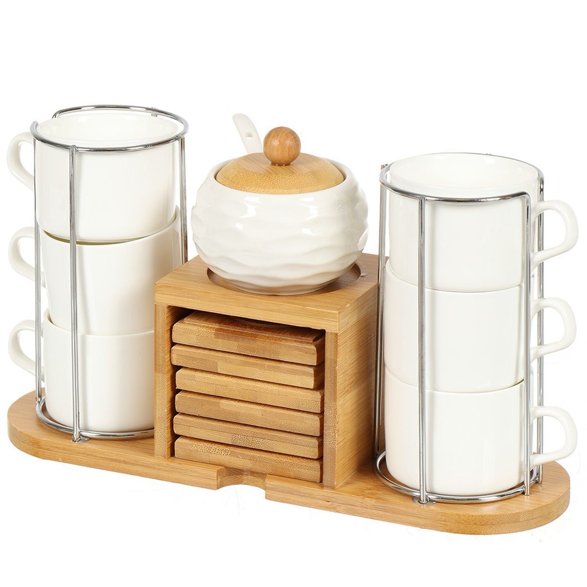 Набор состоит из 6 кружек и бамбуковых подставок. Кружки изготовлены из глазурованной керамики. Теплостойкие ручки обеспечивают комфортное использование. Кружки подходят для горячих и холодных напитков. Изящный дизайн придется по вкусу и ценителям классики, и тем, кто предпочитает современный стиль. Он настроит на позитивный лад и подарит хорошее настроение с самого утра. Изделия можно компактно хранить на подставке, входящей в набор. Оригинальная металлическая подставка станет стильным украшением любого интерьера. Выполненное из экологичного материала изделие отвечает последним интерьерным тенденциям.
