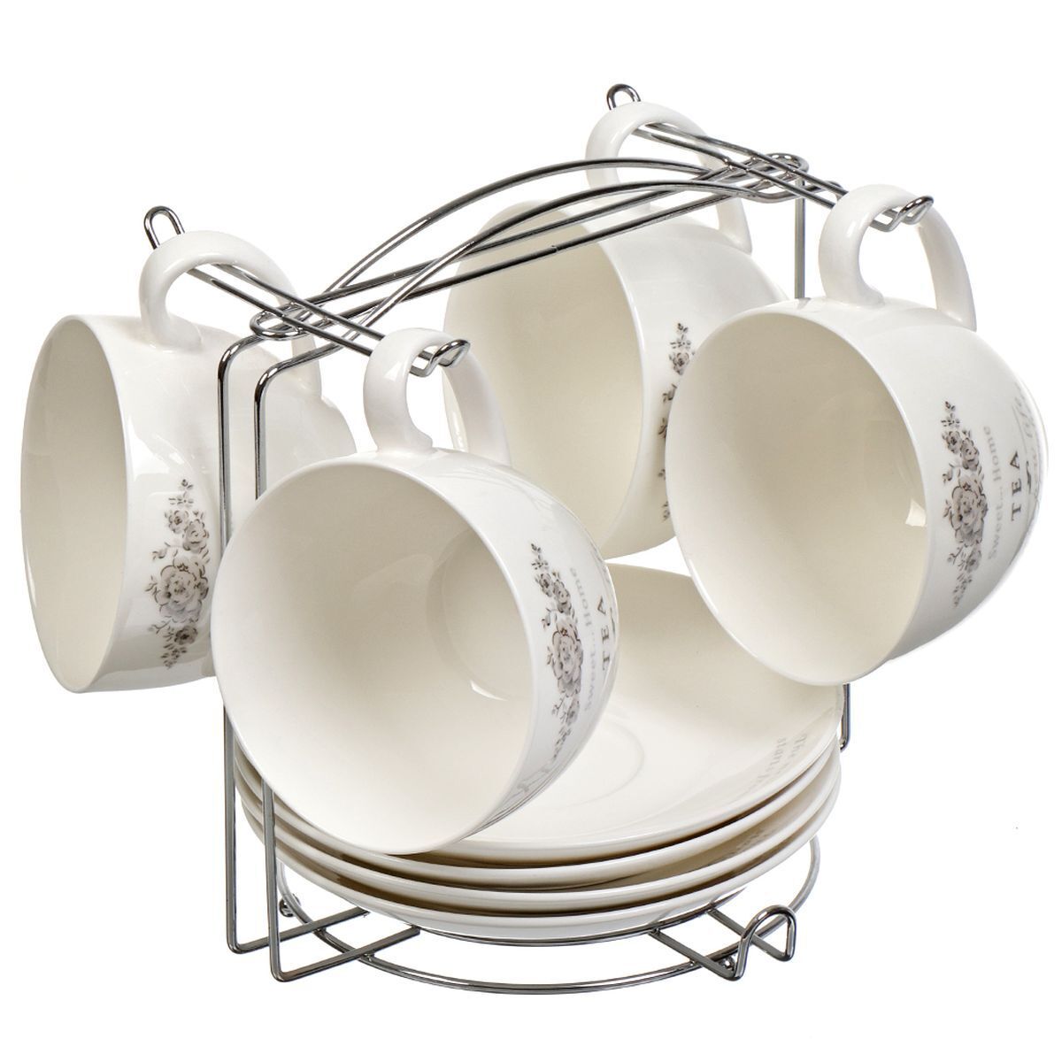 Чайный сервиз на шесть персон включает чашки объемом 180 мл и блюдца. Набор поставляется в комплекте с удобной металлической подставкой для хранения.