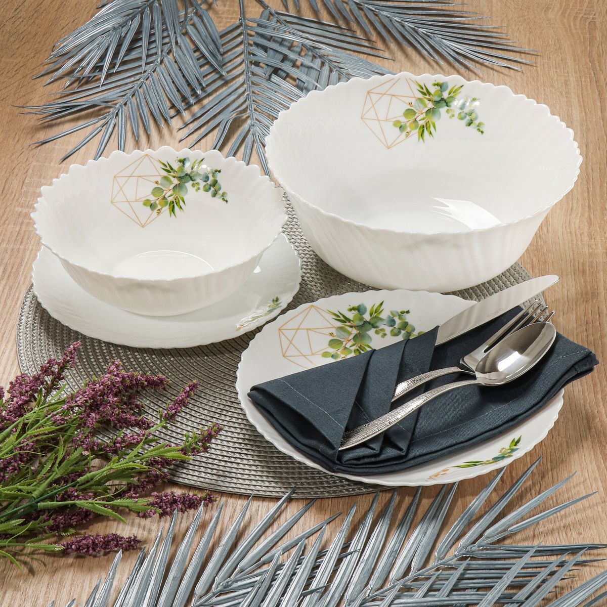 Столовый сервиз изготовлен из экологически чистых материалов и состоит из 19 предметов. Сервиз устойчив к механическим воздействиям. Он подходит для использования в СВЧ печи и посудомоечной машине.