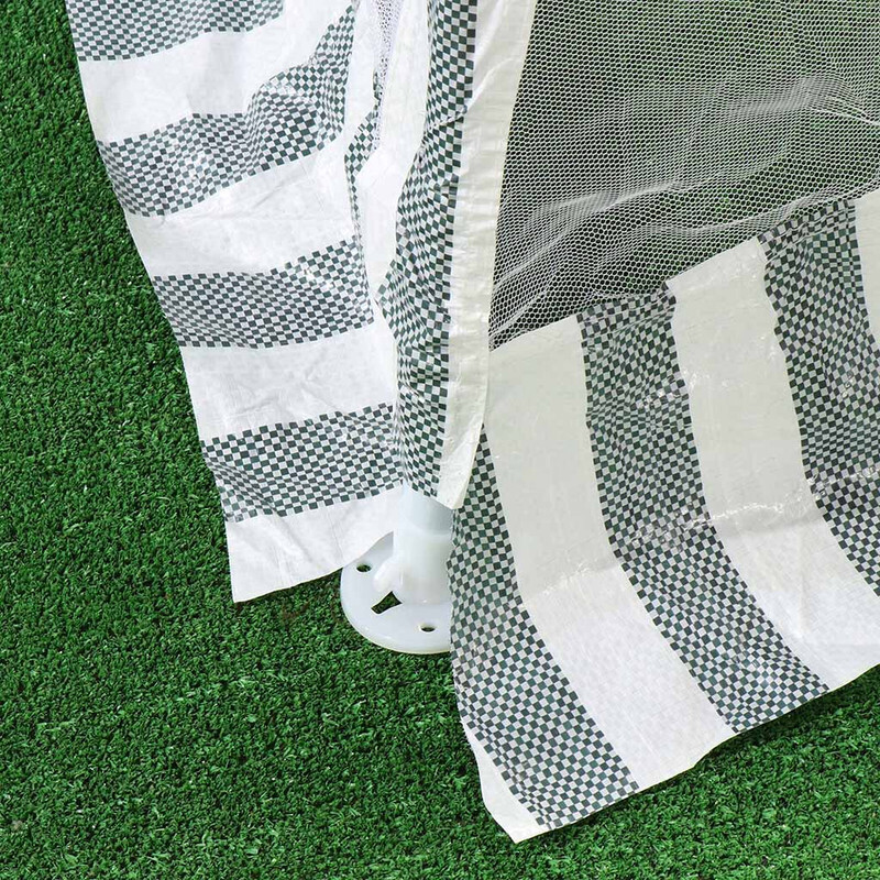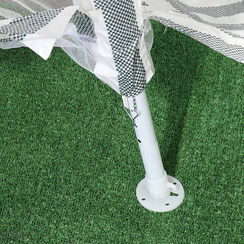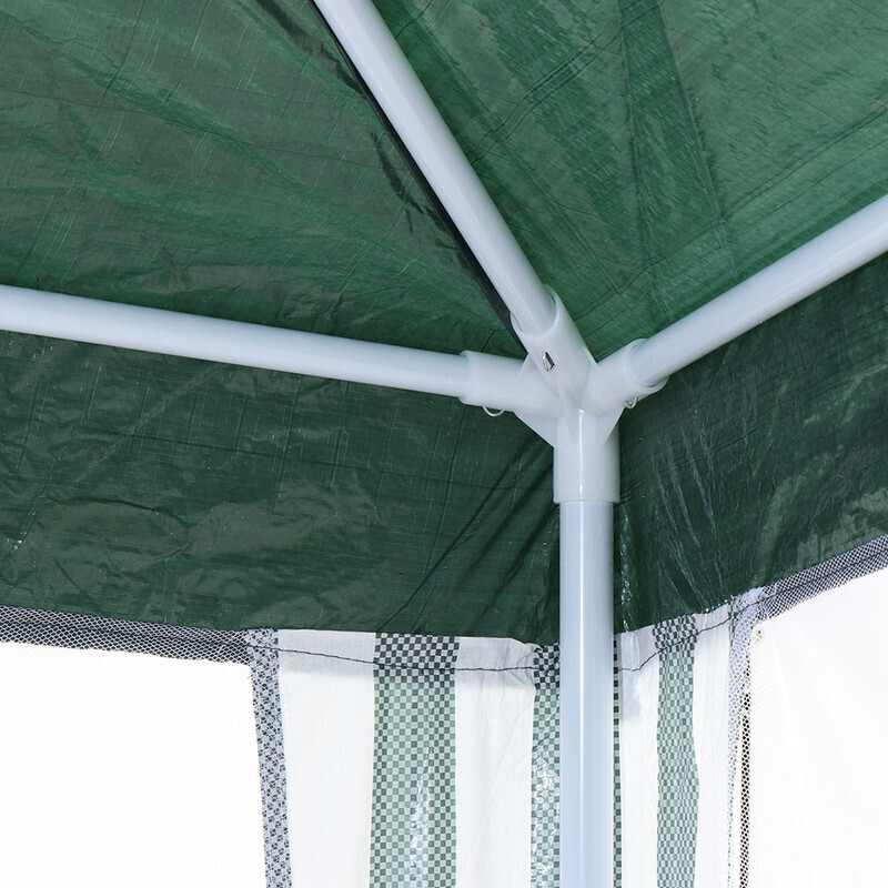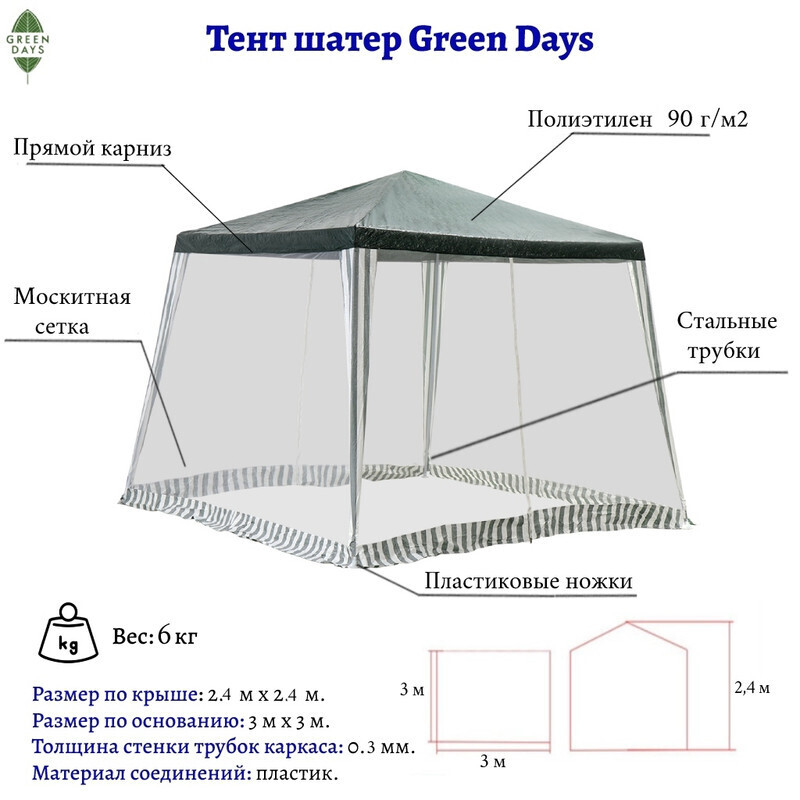 Максимальная высота шатра в собранном виде 2.4 м. Размеры по крыше 2.4 х 2.4 м и по основанию 3 х 3 м. Стальные трубки диаметром 18 мм. Толщина стенки трубок каркаса 0.3 мм.