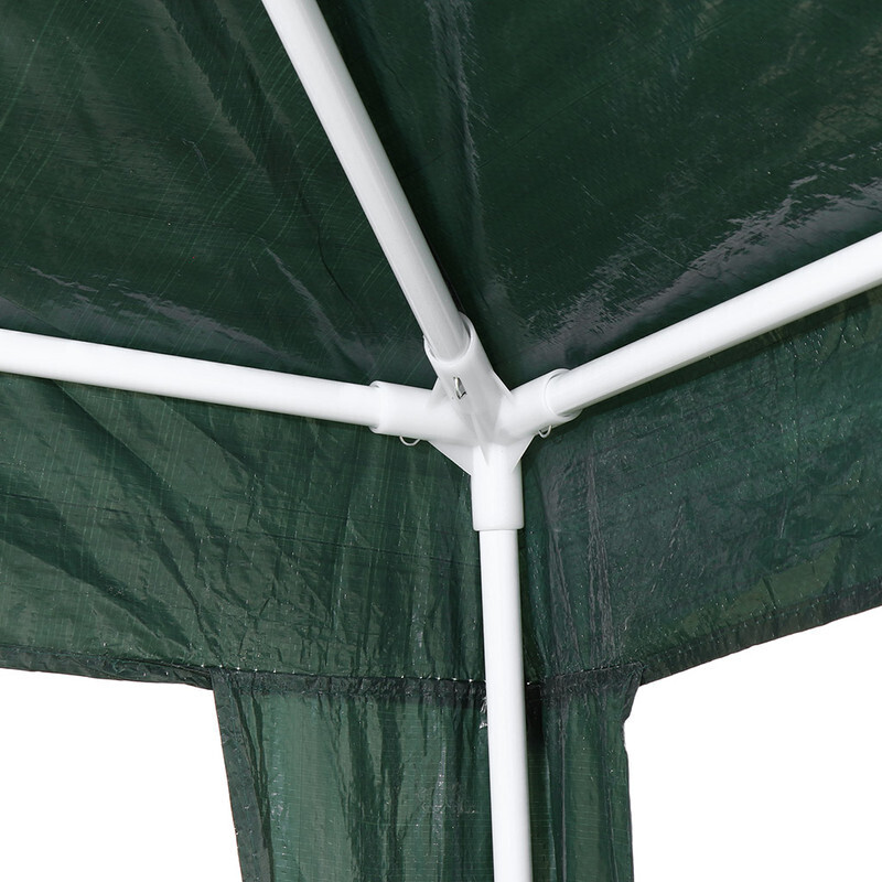 Максимальная высота шатра в собранном виде 2.4 м. Размеры по крыше 2.4 х 2.4 м и по основанию 3 х 3 м. Стальные трубки диаметром 18 мм. Толщина стенки трубок каркаса 0.6 мм.
