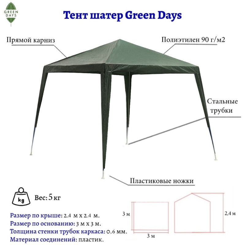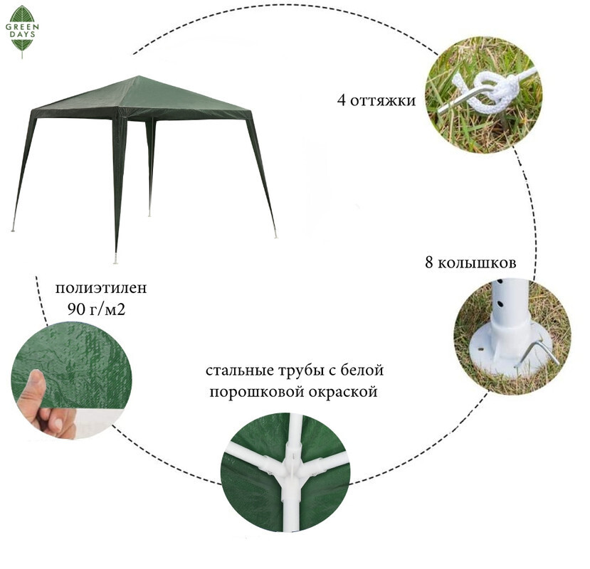Отдохнуть на даче, отправиться на пикник или отметить значимое событие с удобством, помогут тенты шатры Green Days, являющиеся бюджетной и интересной альтернативой беседок. Габариты тентов позволяют с комфортом разместиться большой группе людей.