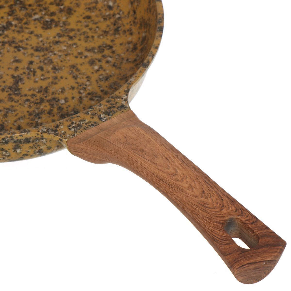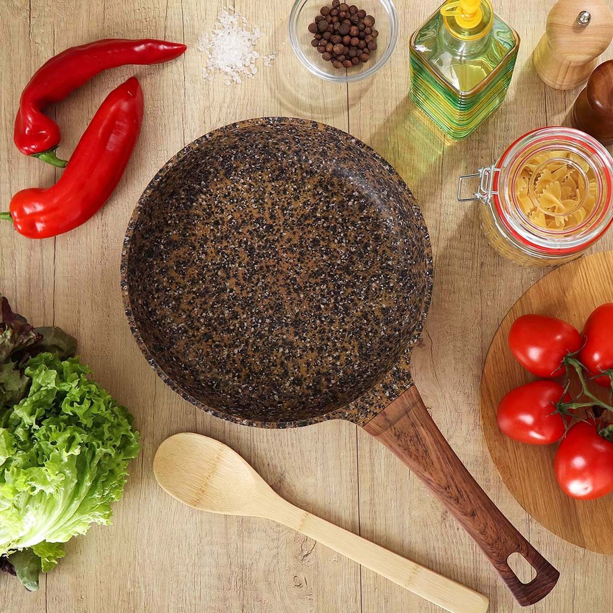 Сковорода выполнена литьем вручную из пищевого алюминия и имеет сверхпрочное антипригарное покрытие, безопасное для здоровья. Антипригарное покрытие обладает высокой прочностью к истиранию, что увеличивает срок службы сковороды в 5 раз. Форма сковороды обеспечивает устойчивость к деформации при длительном использовании. Дно оптимальной толщины 6 мм способствует равномерному распределению тепла для наилучшего приготовления ваших блюд. Толщина стенок 3,6-4 мм. Сковорода имеет удобную ручку, которая не нагревается при эксплуатации. Посуда легко и быстро моется благодаря гладкой непористой поверхности. Сковорода не содержит PFOA, при нагревании не выделяются вредные токсичные и канцерогенные вещества.