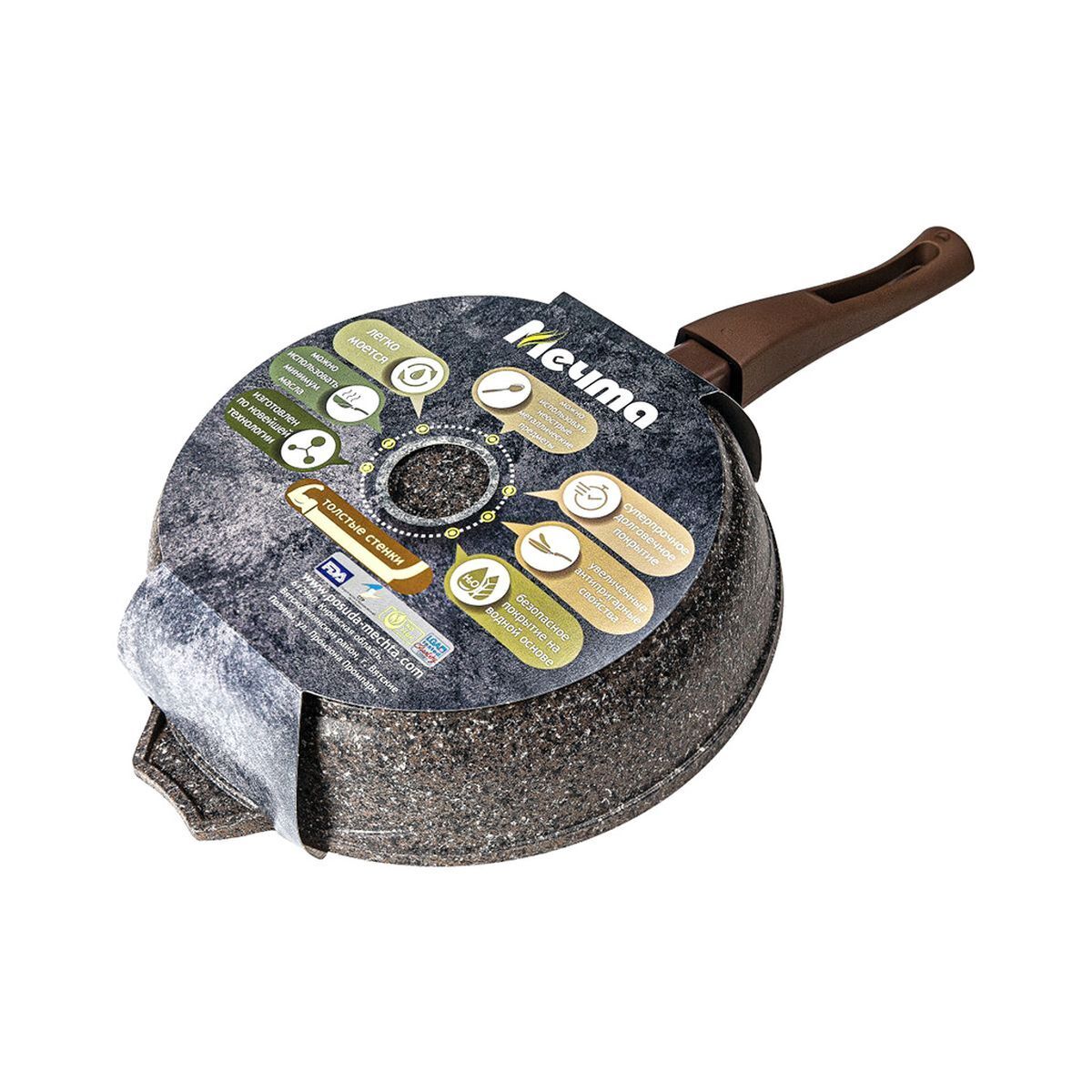 Сковороды торговой марки «Мечта» изготовлены из сплава пищевого алюминия. Это один из самых высококачественных и экологических материалов для производства посуды. Он обладает более высокой теплопроводимостью по сравнению с чугуном или нержавеющей сталью, что ускоряет процесс приготовления блюд, особенно на электроплите. Сковорода с антипригарным покрытием «Мечта» прошла техническое и химическое исследования, и имеют сертификаты соответствия качества, подтверждающие его безвредность для человека.