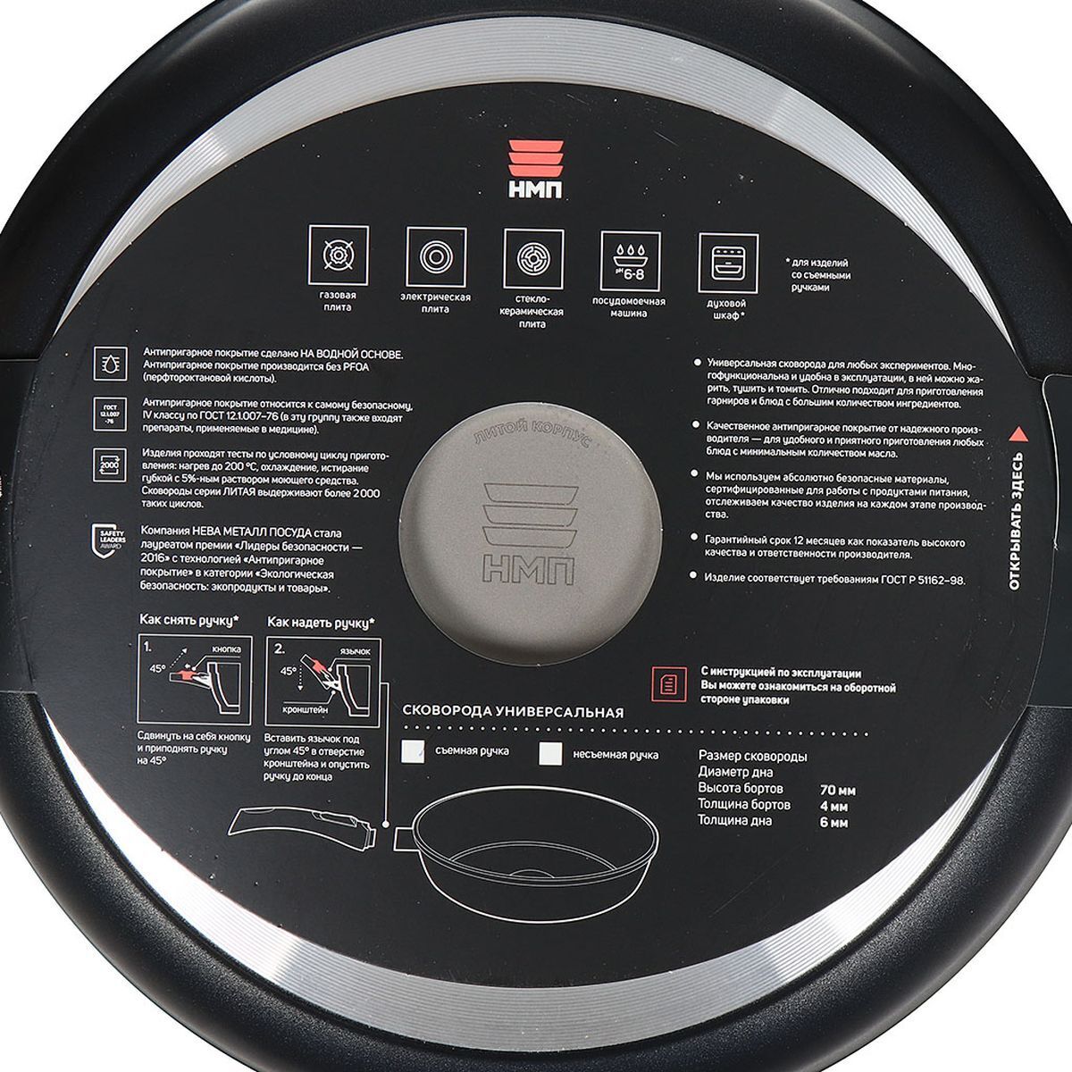 Сковорода многофункциональна, обеспечивает комфорт и легкость в использовании. Благодаря высоким бортам и большой полезной площади дна сковорода отлично подходит для приготовления таких блюд как котлеты, шницели, тефтели, голубцы, жаркое, гуляш. Съемная ручка позволяет трансформировать сковороду в удобную форму для запекания в духовом шкафу; делает её компактнее при хранении.