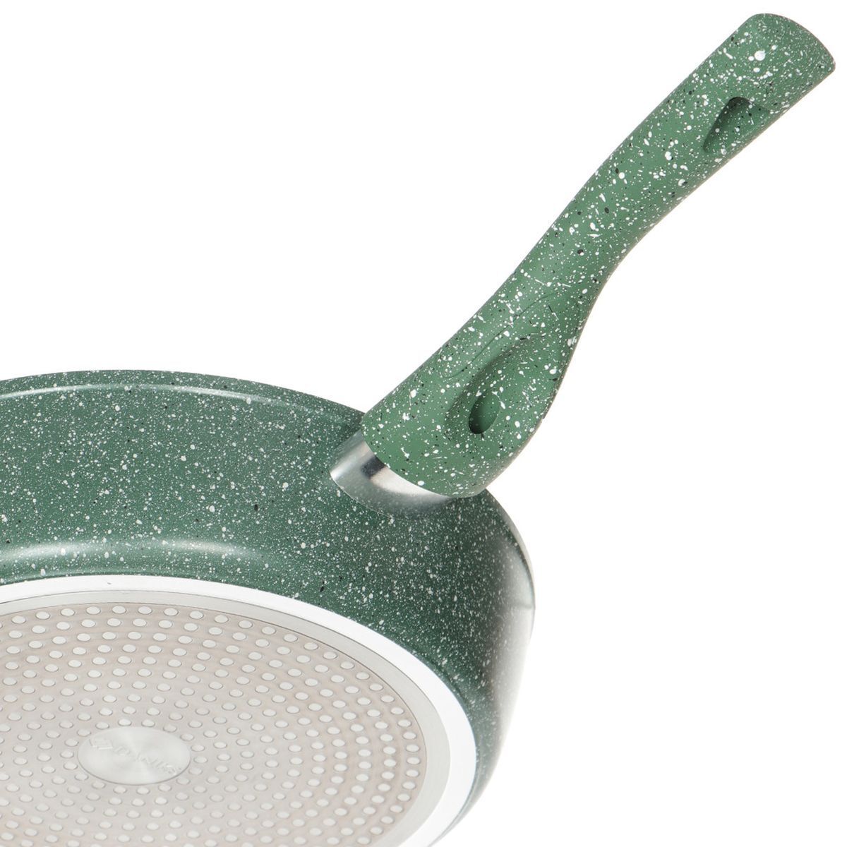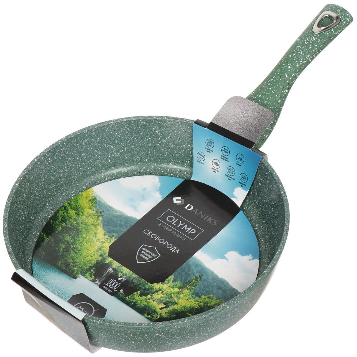 Сковорода выполнена из алюминия с антипригарным покрытием «Мрамор». Не содержит PFOA.