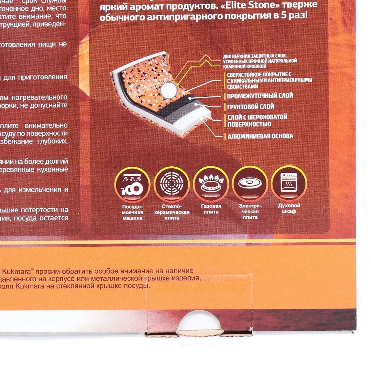 Сковорода с каменным покрытием и съемной ручкой "Kukmara" с многослойным сверхстойким каменным антипригарным покрытием. В состав антипригарного покрытия линии «Elite stone» входят натуральные частицы твердой горной породы в виде каменной крошки. Каменная крошка природного происхождения обладает невероятной прочностью. «Elite stone» тверже обычного антипригарного покрытия в 6 раз!