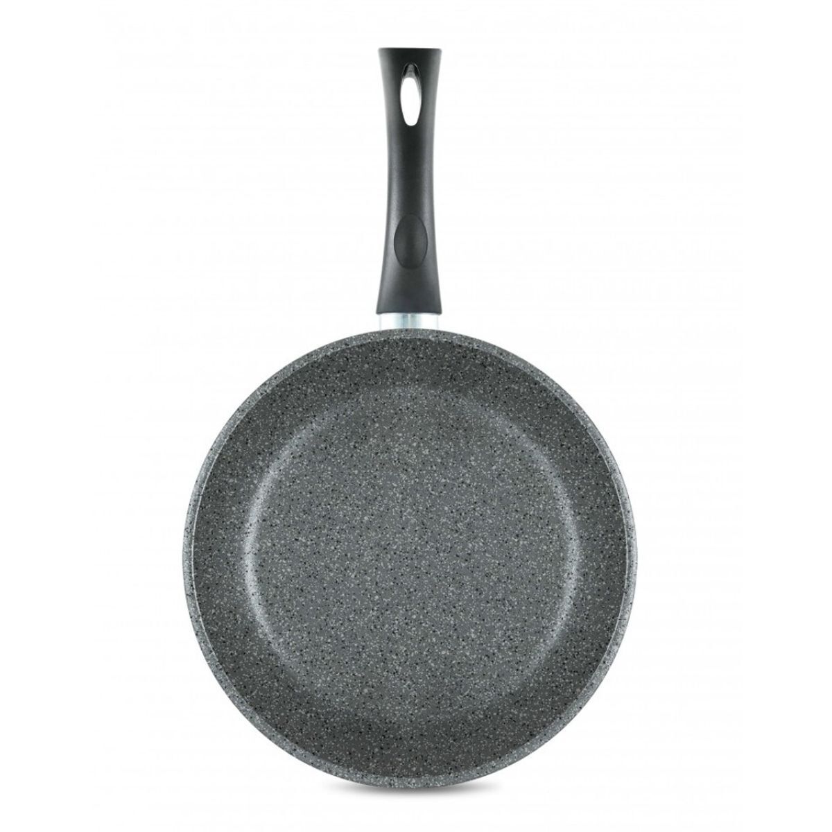 Универсальная сковорода с покрытием с эффектом натурального камня - "серый гранит". Цвет органично сочетается с интерьером кухни и помогает долго сохранять прекрасный внешним вид сковороды.