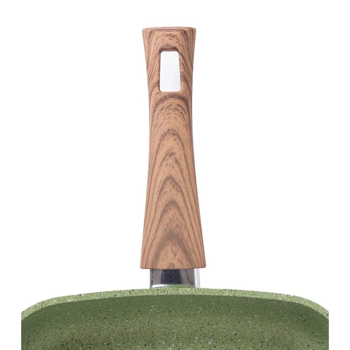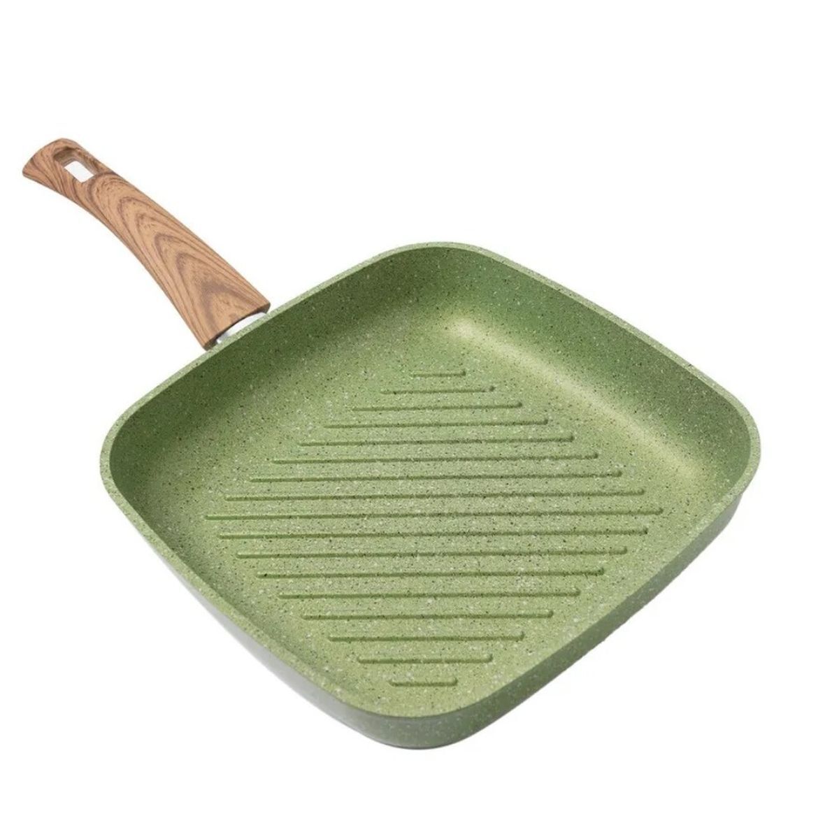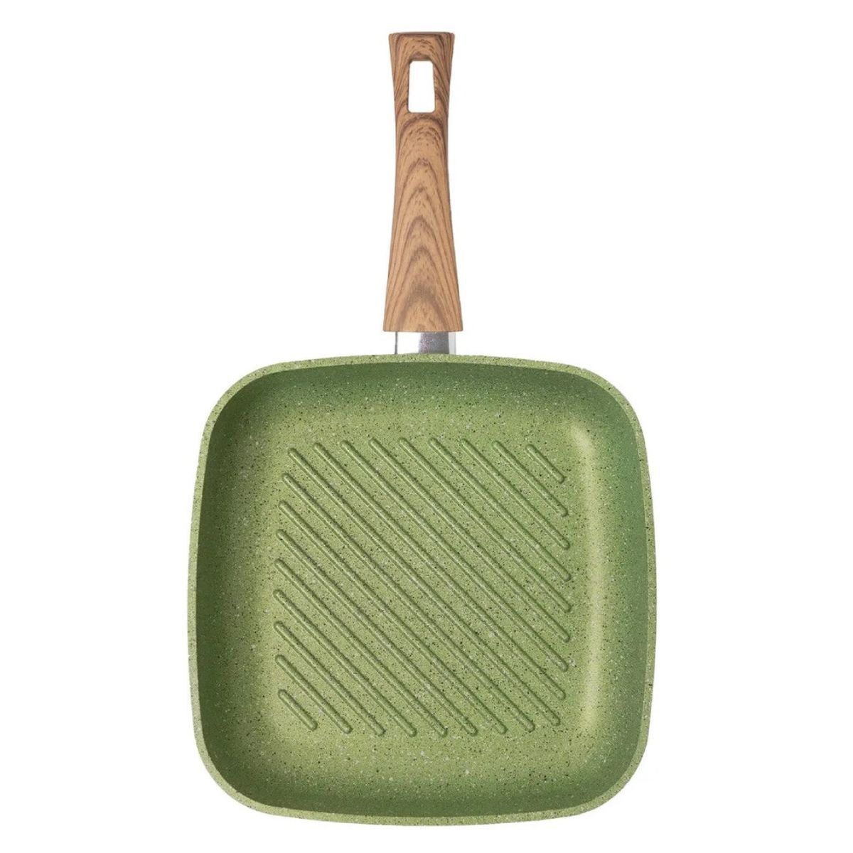 Литая квадратная сковорода-гриль 26[26см из современной экологичной коллекции посуды "Сила природы" воплотит атмосферу природной натуральности и свежести на Вашей кухне. Качественное антипригарное покрытие Quantanium нанесено в три слоя и не допускает пригорания продуктов, позволяя готовить без масла. Покрытие не содержит PFOA (перфтороктановую кислоту), поэтому безопасно для человека. Изделие изготовлено из толстостенного алюминия, который быстро раскаляется и долго держит тепло. Массивное дно равномерно распределяет жар по всей поверхности, обеспечивая равномерную прожарку. С наружной стороны сковороды нанесено жаростойкое силиконовое покрытие, предохраняющее стеклокерамическую плиту от повреждений и загрязнений.