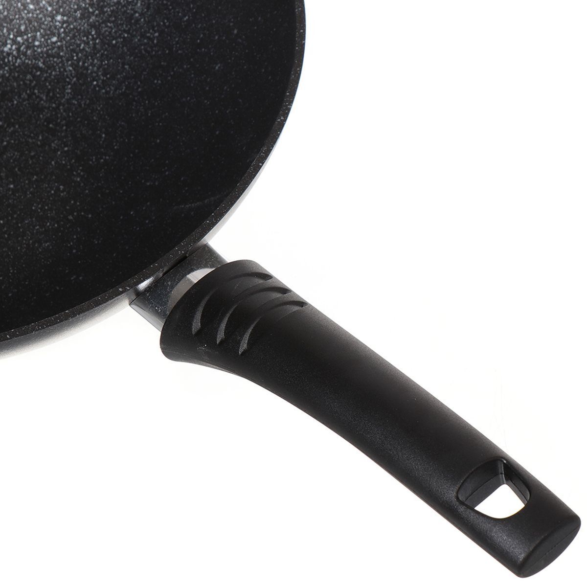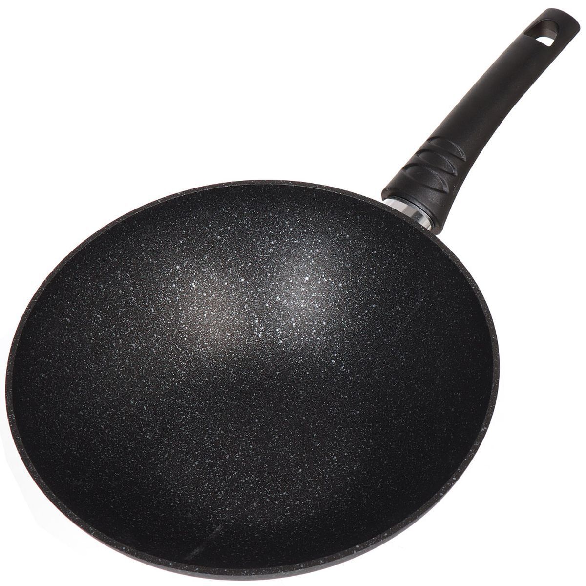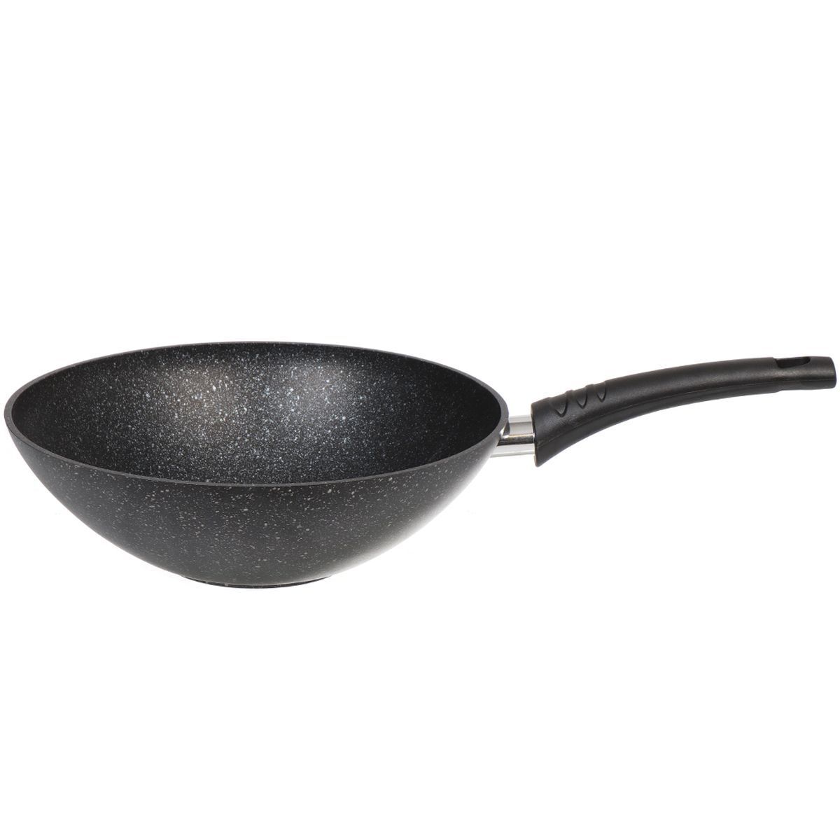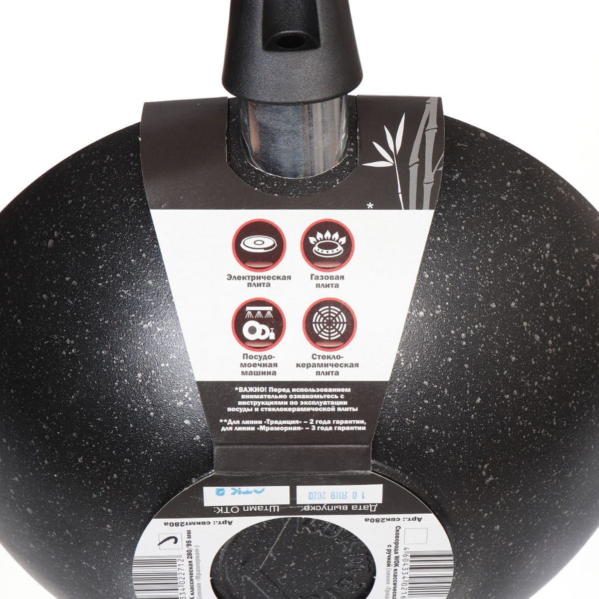 Сковорода WOK с мраморным антипригарным покрытием ("темный мрамор") производства ОАО "Кукморский завод Металлопосуды" (Россия, Республика Татарстан). Основа сковород - толстостенный литой алюминий, полученный методом ручного литья, что обеспечивает долгий срок службы и высокую прочность посуды.