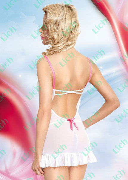 Выглядеть женственно и игриво одновременно? С этой сорочкой – нет проблем! Кокетливый наряд, передняя часть которого выполнена из плотного, но нежного атласа, а задняя – из полупрозрачной сетевой ткани, способен усиливать возбуждение мужчины за считаные секунды. Дополнительное кокетство придают как бантики на лифе и подоле, так и пышные рюши. Состав комплекта: сорочка и трусики-стринг.