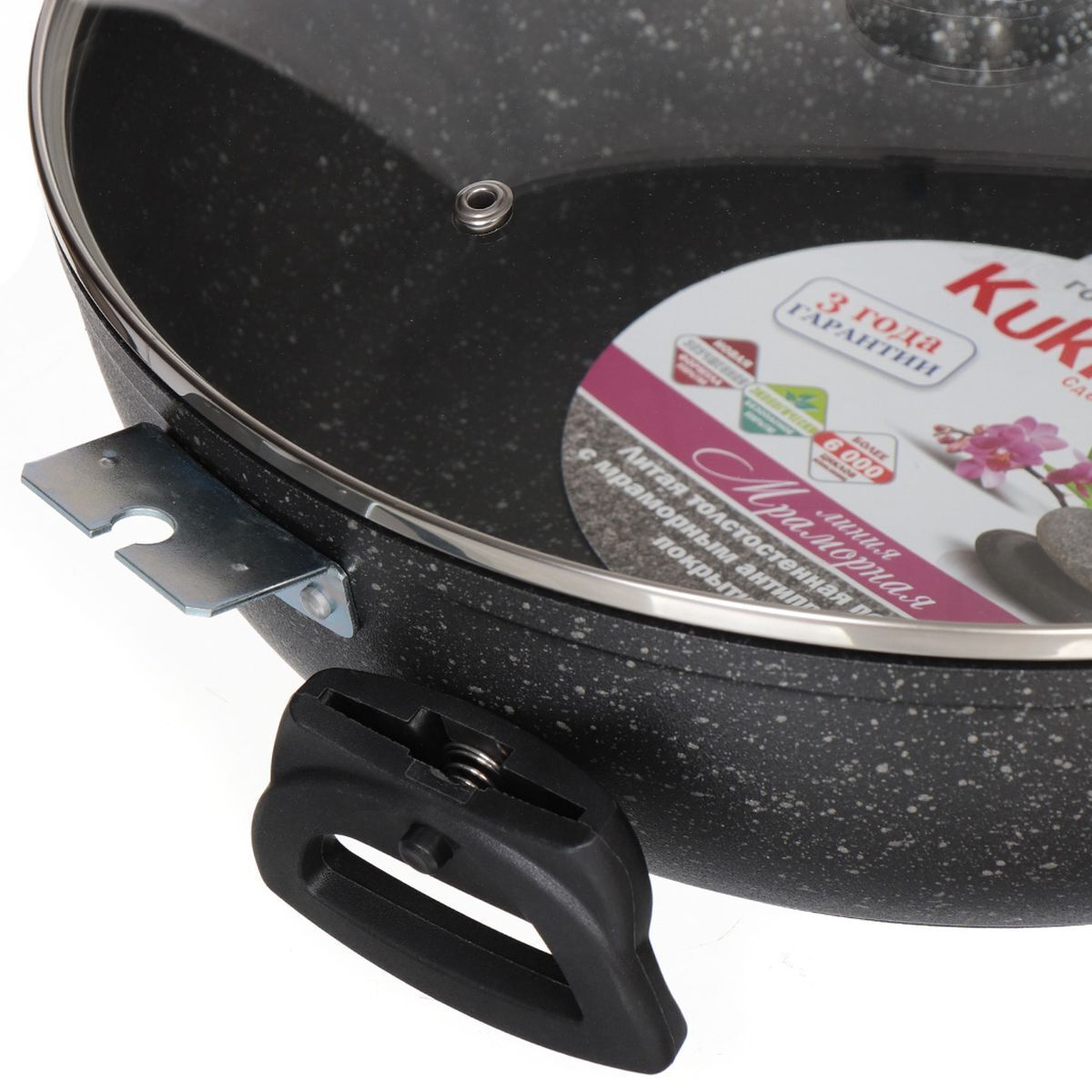 Сотейник с антипригарным мраморным (гранитным) покрытием ("темный мрамор") производства ОАО "Кукморский завод Металлопосуды" (Республика Татарстан). Основа сотейника - толстостенный литой алюминий толщиной до 6 мм, что обеспечивает долгий срок службы и высокую прочность посуды.