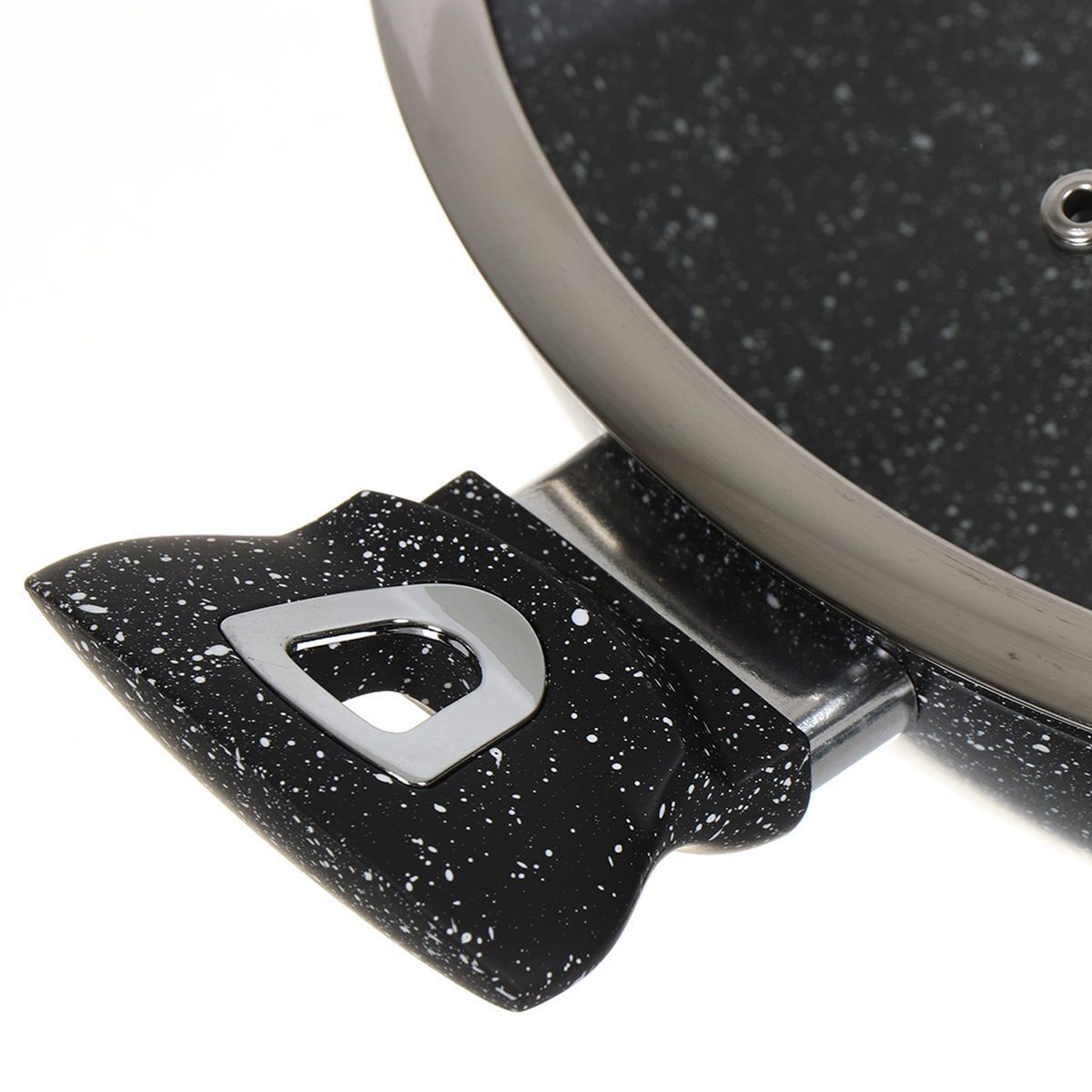 Жаровня Daniks Олимп изготовлена из алюминия с высококачественным внутренним покрытием в 3 слоя. Такое покрытие предотвращает пригорание пищи и ее прилипание к стенкам. Оно абсолютно безопасно для здоровья и не выделяет вредных веществ во время готовки. Цвет антипригарного покрытия - черный мрамор.