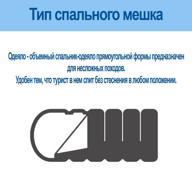 Объемный спальник-одеяло прямоугольной формы предназначен для несложных походов. Удобен тем, что турист в нем спит без стеснения в любом положении.