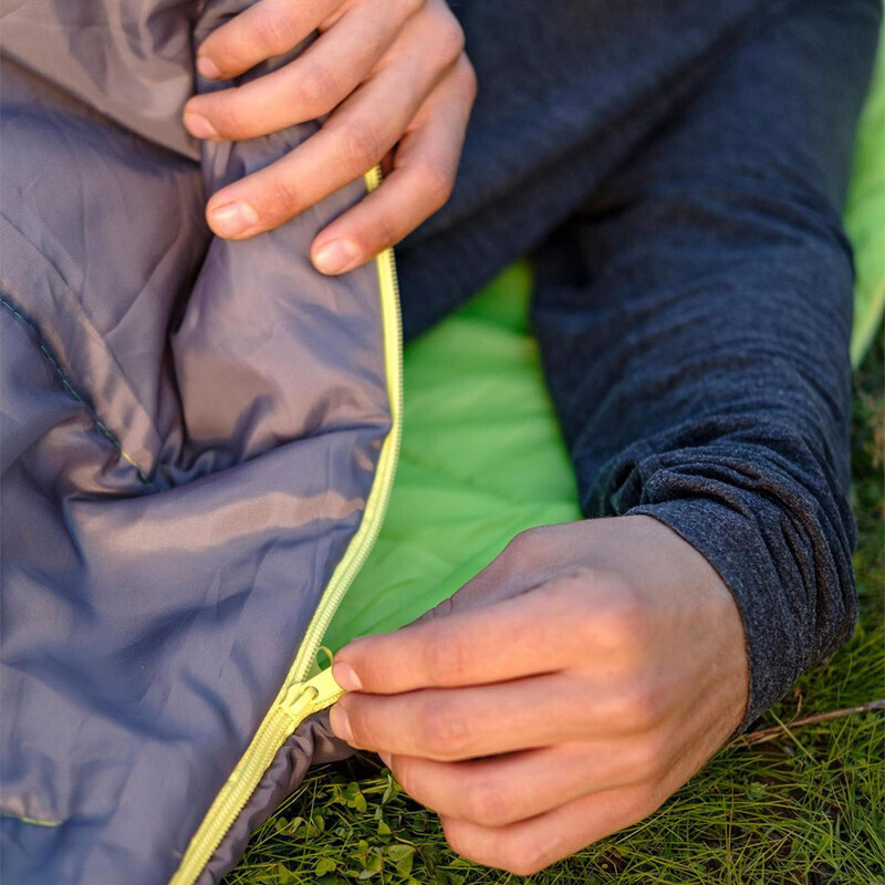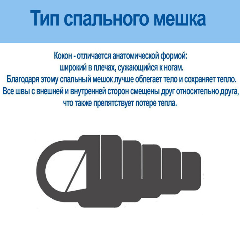 Кокон - отличается анатомической формой: широкий в плечах, сужающийся к ногам. Благодаря этому спальный мешок лучше облегает тело и сохраняет тепло. Все швы с внешней и внутренней сторон смещены друг относительно друга, что также препятствует потере тепла.