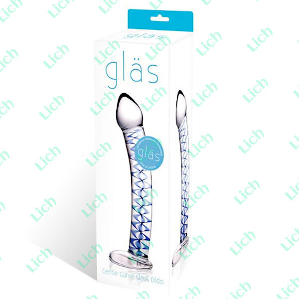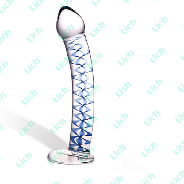 Прозрачный изогнутый стимулятор с большой головкой с синим рисунком внутри в форме спирали. Общая длина: 20 см. Максимальный диаметр: 4 см.
