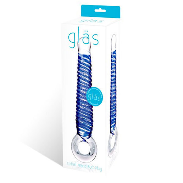 Качественная втулка из прозрачного стекла, покрытая спиралью желобков, окрашенных синим цветом. Кольцо-держатель обеспечивает более комфортное использование. Длина без кольца -16 см. Диаметр - 3 см.