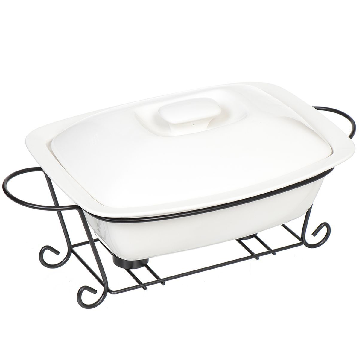 Мармит выполнен из керамики белого цвета. Керамическая чаша с удобными ручками располагается на стальной подставке с двумя подсвечниками для чайных свечей (не входят в комплект). Свеча устанавливается на подставку, нагревает чашу снизу, таким образом поддерживая нужную температуру приготовленного блюда. Крышка прикрывает чашу сверху, не давая остыть блюду. Благодаря своему элегантному дизайну, мармит с приготовленным блюдом можно сразу подавать на стол, не перекладывая еду на сервировочные тарелки. Изящный, с современным дизайном, мармит украсит любой праздничный стол, а блюда в нем будут всегда теплыми и ароматными.