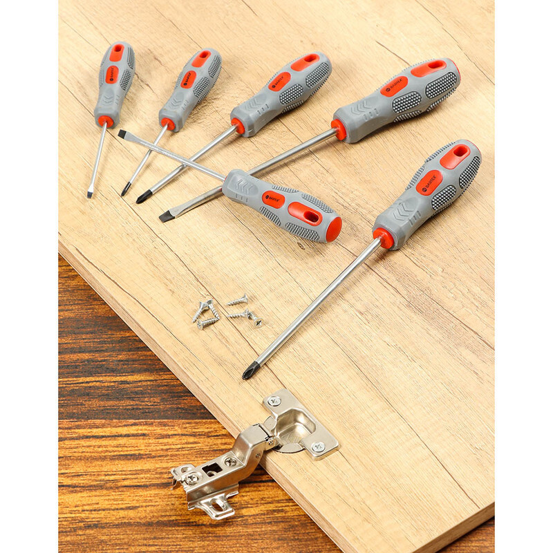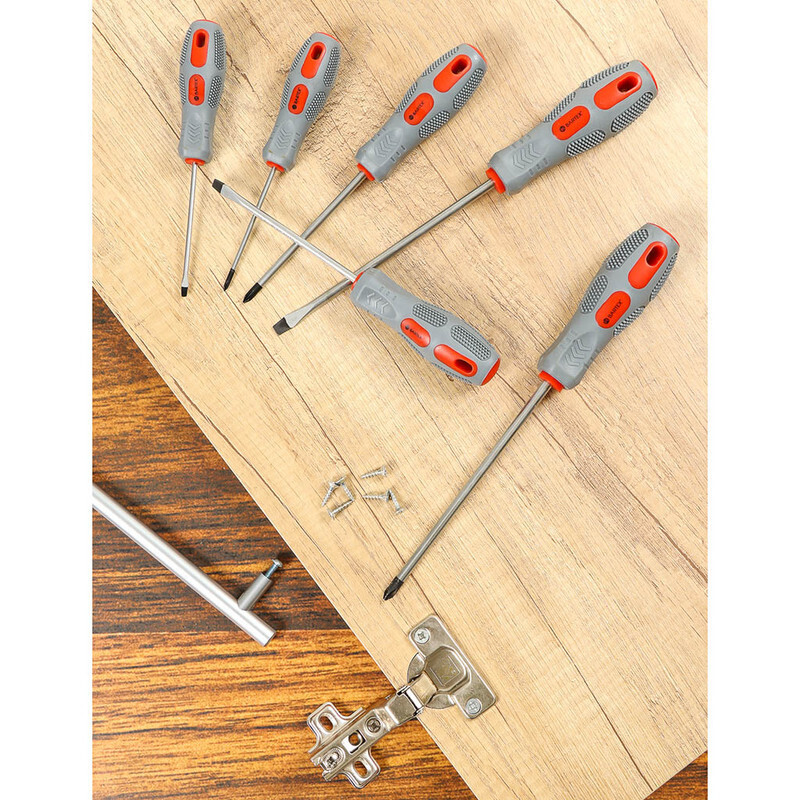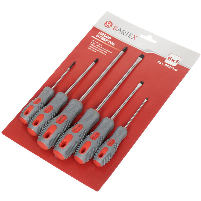 Набор отверток Bartex изготовлен из высококачественных материалов. Стержень произведен из хромованадиевой стали твердостью 46 HRC. Наконечник оксидирован для повышения стойкости к коррозии и повреждениям, а также намагничен. Двухкомпонентная рукоятка не скользит в руке, имеет удобную эргономичную форму, а так же отверстие для подвески.
