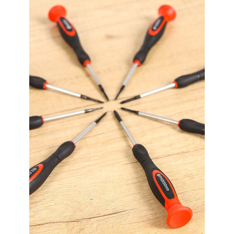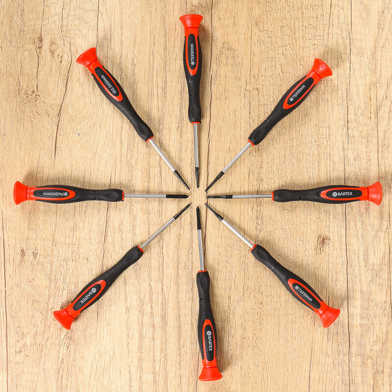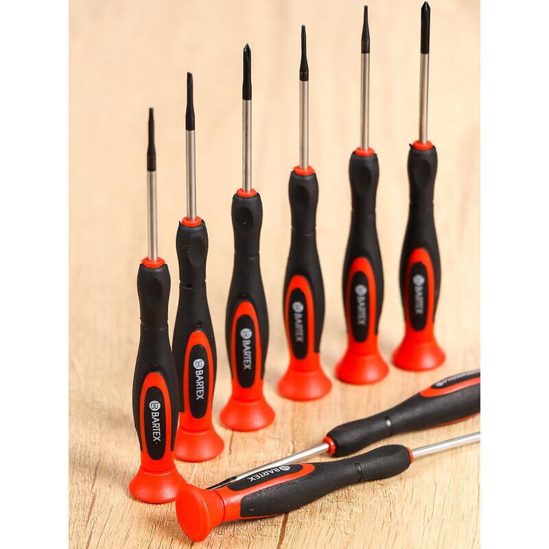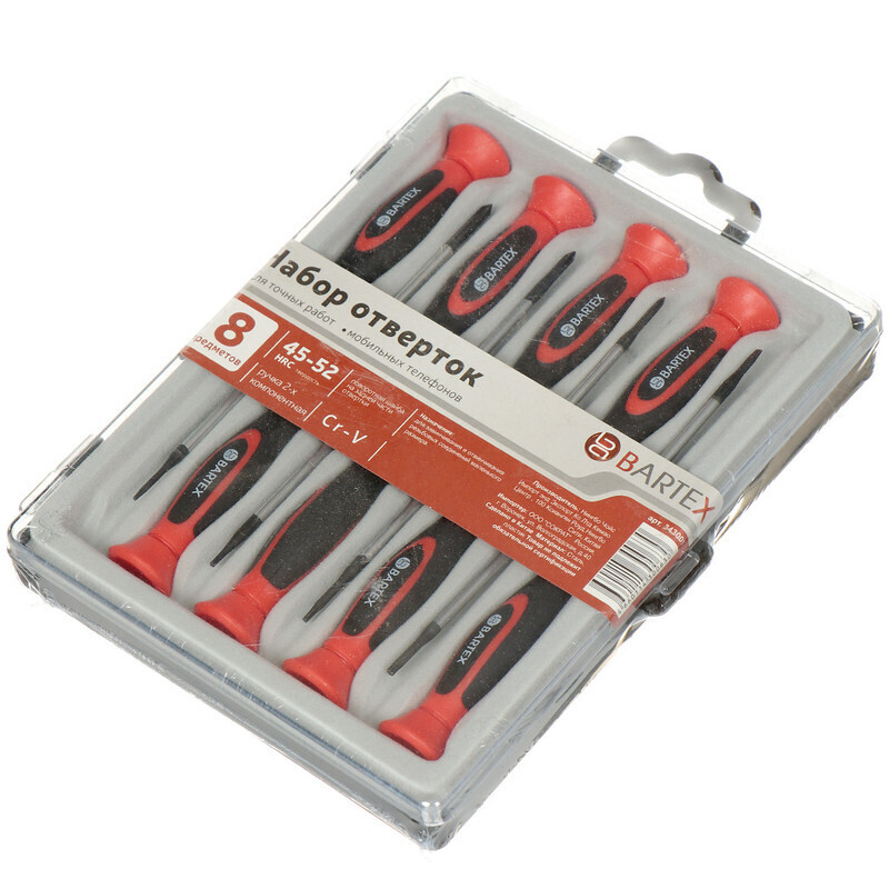 Набор отверток торговой марки Bartex предназначен для завинчивания и отвинчивания резьбовых соединений маленького размера. Отвертки из данного набора незаменимы при работе с электроникой, часами и прочими мелкими соединениями. Эргономичная двухкомпонентная рукоятка удобно располагается в руке и позволяет с ювелирной точностью манипулировать мелкими деталями. Тыльная сторона отвертки оснащена поворотной шайбой. При помощи шайбы можно легко и быстро вращать инструмент простым перебором пальцев. Упакован набор в пластиковый бокс, удобный для хранения и транспортировки.