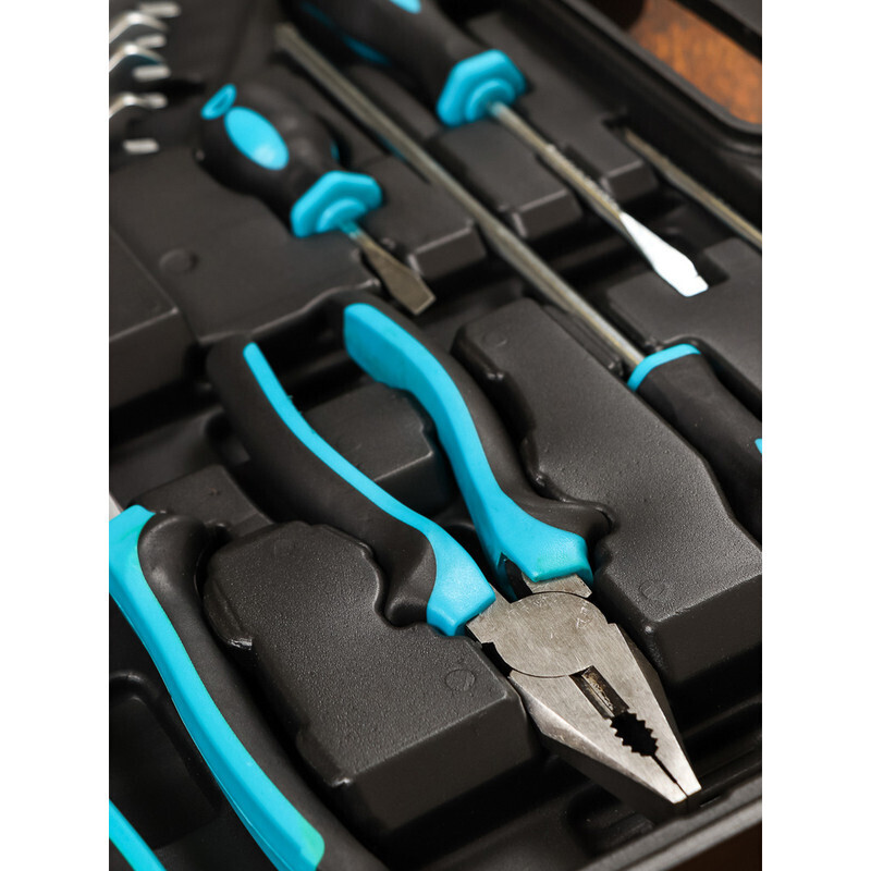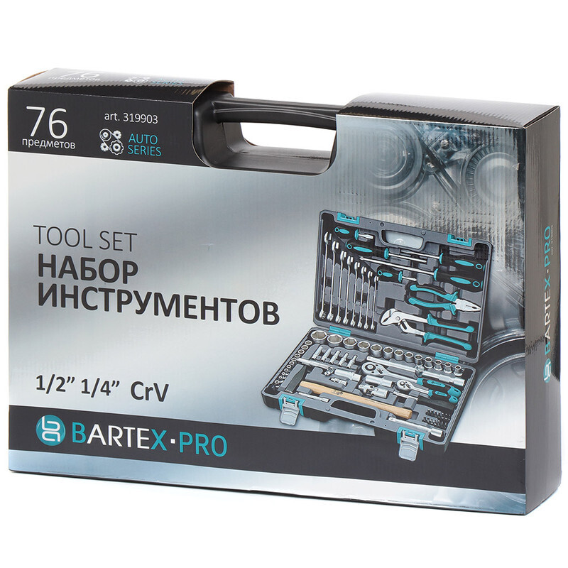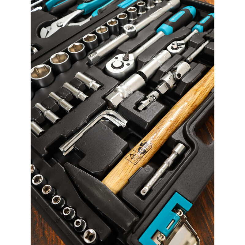Набор инструментов, состоящий из 76 наименований, выполнен из высококачественной хромованадиевой стали. Сильными сторонами этого материала являются высокая стойкость к усталостным и ударным нагрузкам, а также к коррозии. Компоненты набора прослужат вам долго, без потери своих свойств. Ручной инструмент позволяет провести ремонтные работы и в доме, и в машине.