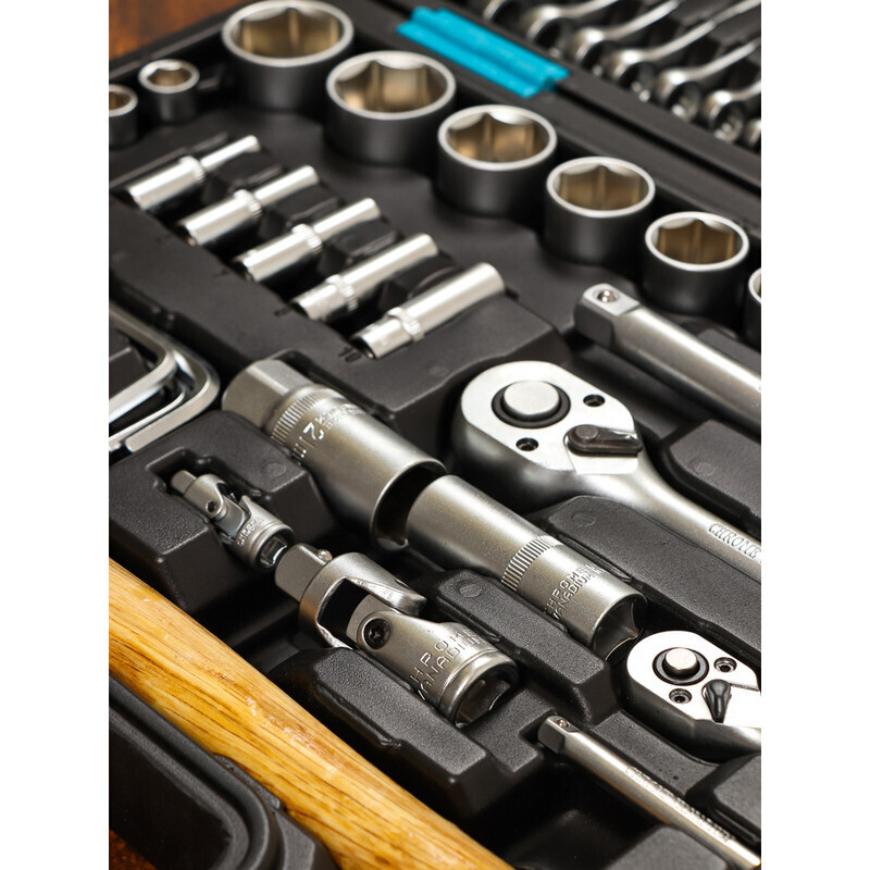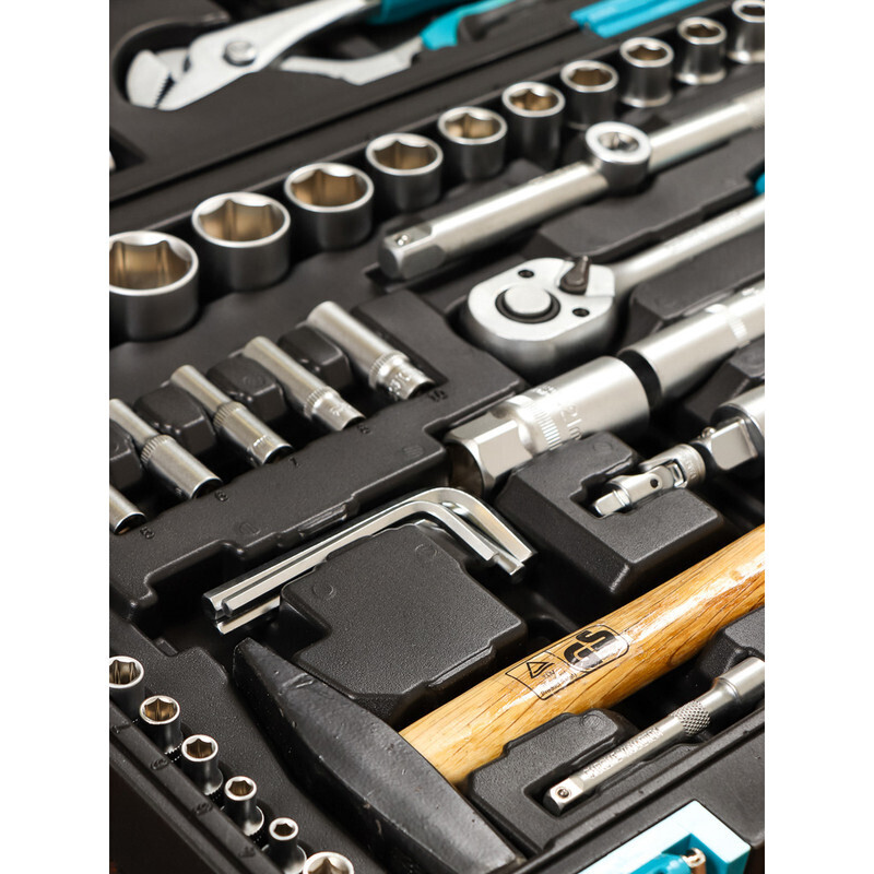 Инструменты помещены в прочный и стильный чемодан для инструментов, который удобно брать с собой в дорогу. Каждая деталь в кейсе фиксируется на своем месте, а металлические замки-защелки не позволяют деталям рассыпаться.
