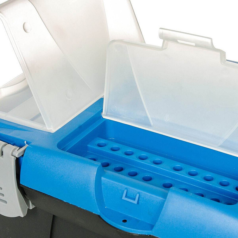 Крышка ящика оснащена тремя прозрачными отделениями, которые закрываются на защелку. Для более комфортного переноса в руках, на крышке предусмотрена удобная ручка.