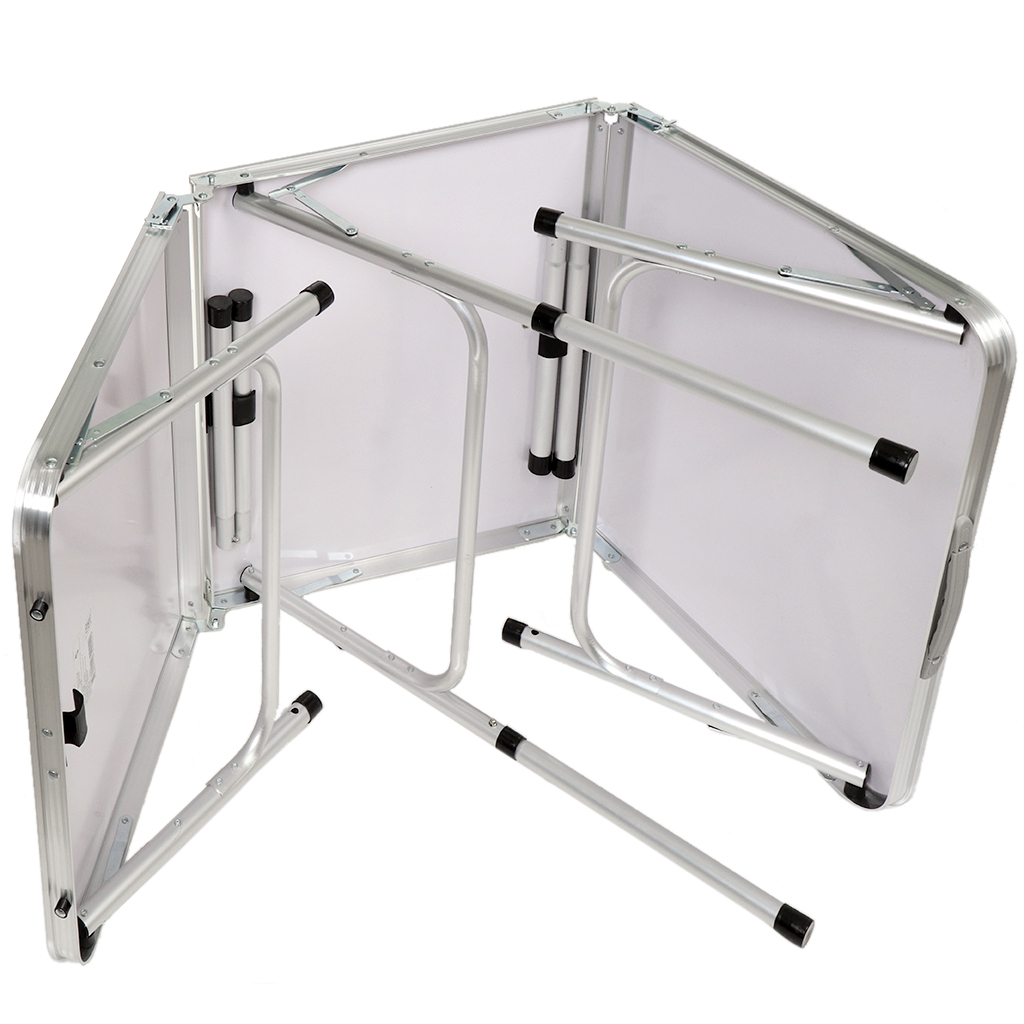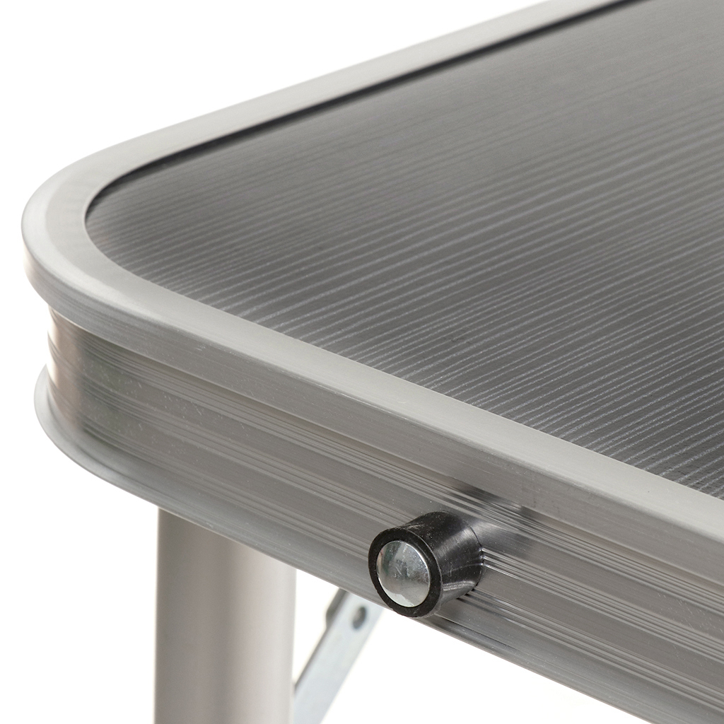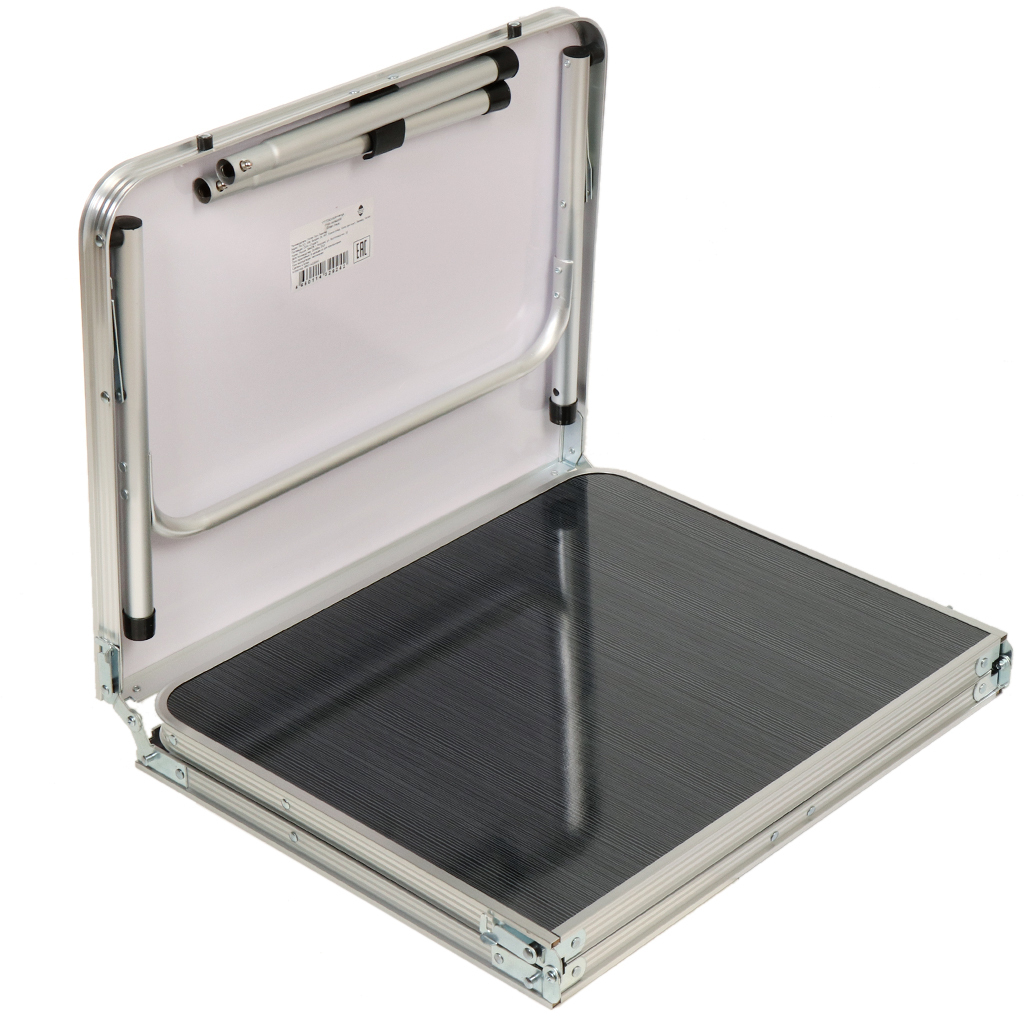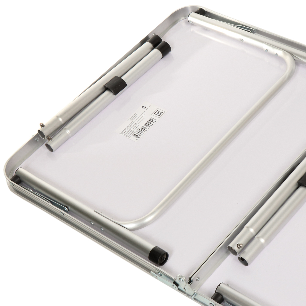 Стол имеет алюминиевый корпус и столешницу из МДФ. Алюминиевые модели столов очень практичны. Этот материал легкий, но очень прочный. Конструкция способна прослужить много лет при аккуратном обращении. МДФ не выделяет вредных веществ и неприятного запаха даже при нагревании и не впитывает воду. Ножки стола прорезинены.