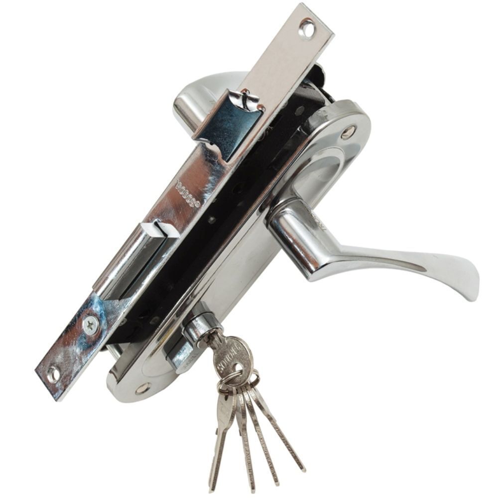 Замок врезной с ручками. Предназначен для установки в деревянные двери толщиной до 40 мм, правого и левого открывания. Межосевое расстояние - 70 мм. Удаление ключевого отверстия - 40 мм. Материал ручек - алюминий. Гальваническое покрытие. Комплектация: цилиндровый механизм 60 мм, ключ-ключ, 5 ключей, ответная планка, винтовые стяжки.