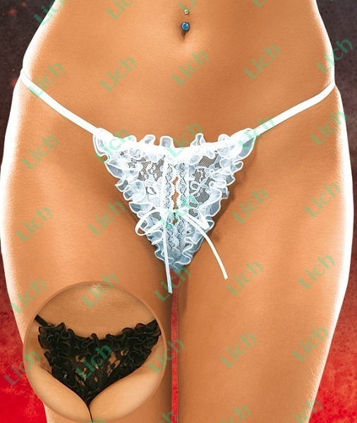Кажущиеся такими пышными, благодаря рюшечкам, трусики-стринг – идеальный «заслон» для гладенькой и нежной зоны бикини. Проверить, насколько она горяча и сладка, мужчина сможет за пару секунд. Достаточно ослабить завязочки и проникнуть внутрь пикантного разреза.
