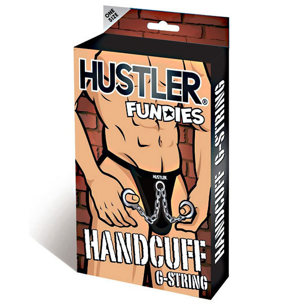 Мужские черные трусы-стриги украшеные спереди маленькой петелькой, на которую крепится на карабине пара маленьких антуражных наручников для больших пальцев. Размер трусов универсальный. Материал: 100% полиэстер.