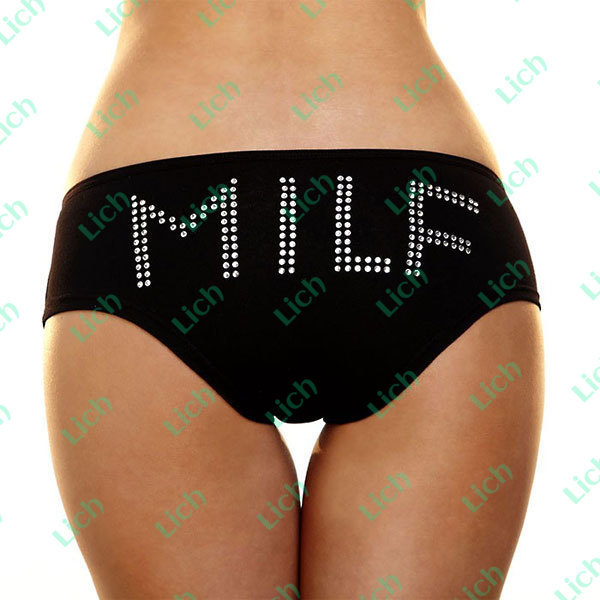 Комфортные и эластичные трусики-слип из гладкого однотонного материала, который приятно сидит на теле. Модель с заниженной линией талии, сзади с надпись из страз - MILF (аббревиатура, обозначающая на сленге: Мамаша, которую я бы не прочь поиметь).