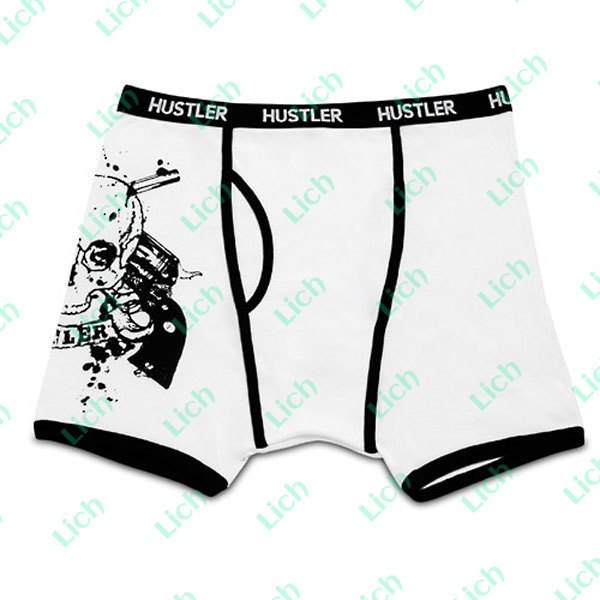 Белые обтягивающие боксеры Hustler на узкой черной резинке. На передней правой стороне: брутальное изображение двух револьверов и черепа с надписью Hustler. Трусы с классической посадкой поэтому отлично подходят для повседневной носки.