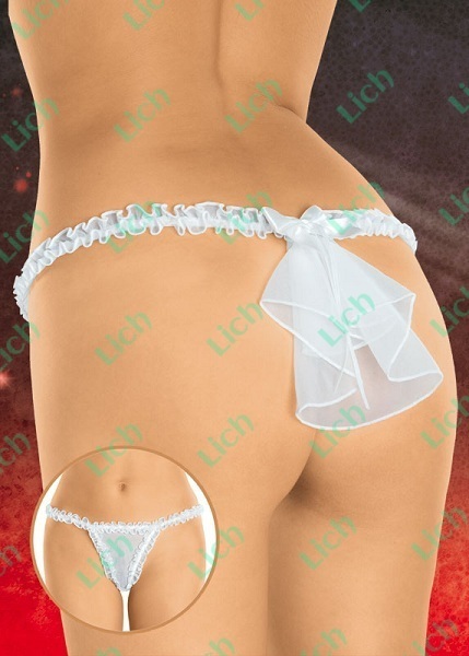 Эти белоснежные трусики-стринг с рюшами пригодятся вам в нескольких случаях. Например, для первой брачной ночи. А еще - для ночи в игру… «первая брачная ночь». Пышная фата на попке усилит вашу привлекательность, особенно в нижней части тела. Она же привнесёт в вашу игру особую куртуазность и страсть.