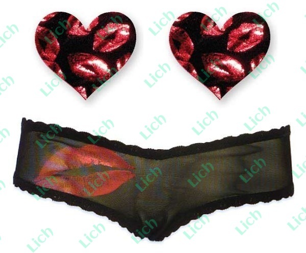 Комплект из 1 пары пэстис-сердечек с губками и черных трусиков с принтом-поцелуем