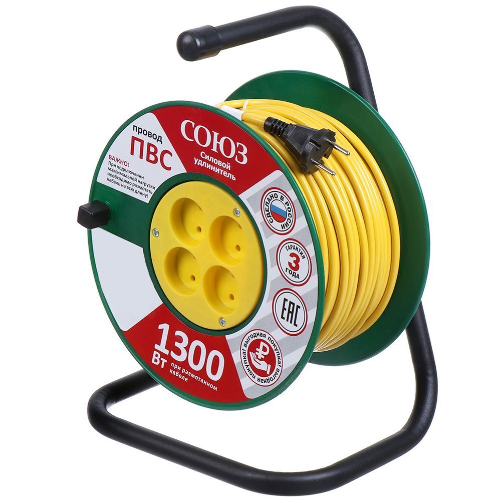 Силовой удлинитель Союз на катушке, 4 гнезда без заземления, сечение провода – 2x0,75 мм. Предназначен для подключения инструментов, находящихся на удалении от электросети. Катушка изготовлена из пластика, расположена на стальной стойке и оснащена ручкой для удобной переноски удлинителя.