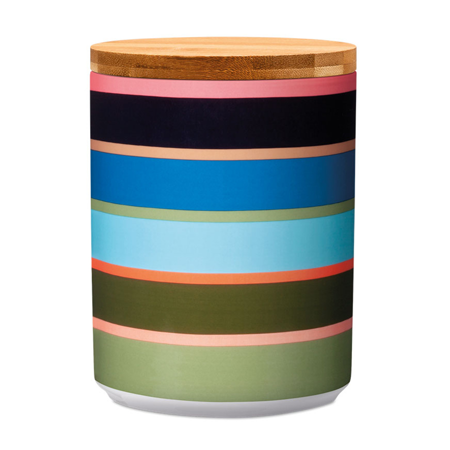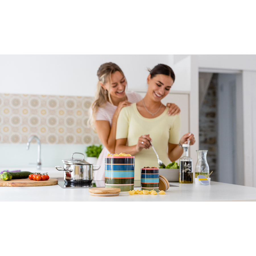Большая банка в ярком, привлекательном дизайне прекрасно подойдет для хранения таких продуктов, как паста, мука, рис или кофе.