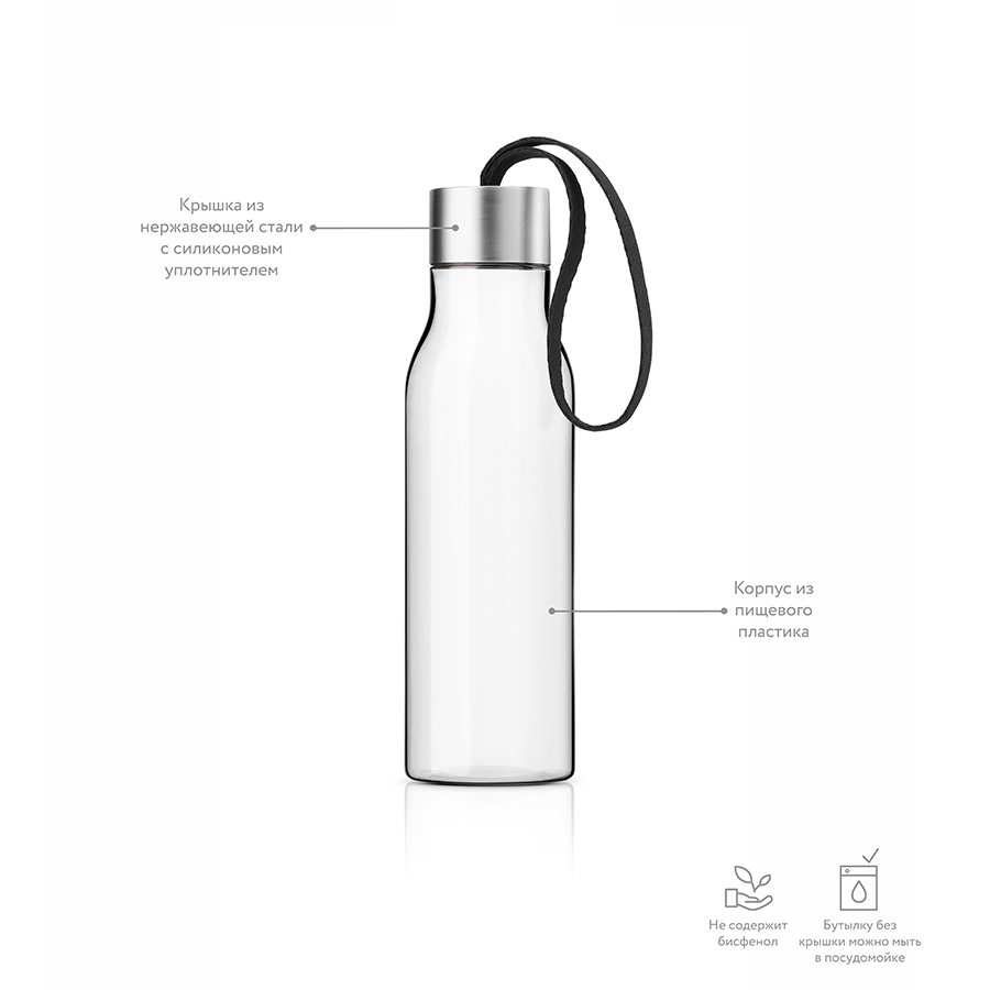 Очень удобная бутылка для воды, которую можно положить в сумку, взять с собой в офис или использовать на отдыхе. Она полностью герметична, её можно наполнять снова и снова, и тем самым уменьшить количество пластиковых бутылок, тем самым помогая сохранить окружающую среду. Бутылка сделана из пластика, не содержащего BPA, то есть бисфенола, вредных примесей и тяжёлых металлов. Бутылку можно мыть в посудомоечной машине, крышку - вручную.