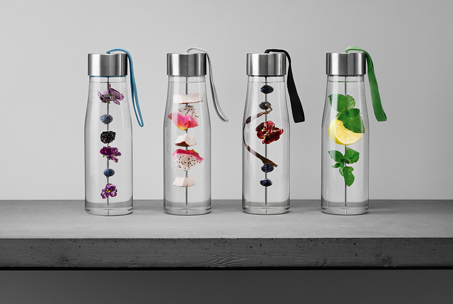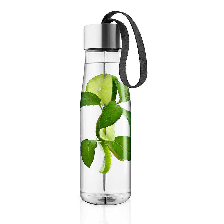 Бутылка для воды — это стильный и современный аксессуар для всех, кто следит за своим здоровьем. Дизайнеры бренда Eva Solo создали оригинальное дополнение к классической модели бутылки — съёмную шпажку для фруктов, которая крепится к крышке. Освежите воду кусочками свежих ананасов, клубники, огурцов или дольками цитрусовых или имбиря, такой напиток зарядит бодростью в течение дня. Бутылка прекрасно подойдет для прогулок пешком или на велосипеде, а также для занятий спортом. Благодаря тканевому ремешку её удобно носить в руках. Герметично закрывающаяся крышка не позволяет жидкости разлиться, если бутылка находится в сумке или рюкзаке. Модель выполнена из качественного ударопрочного пластика, в составе которого отсутствуют вредоносные примеси, такие как фталаты и бисфенол-А. Бутылка подходит для мытья в посудомоечной машине, крышку рекомендуется мыть вручную. Объём 750 мл.