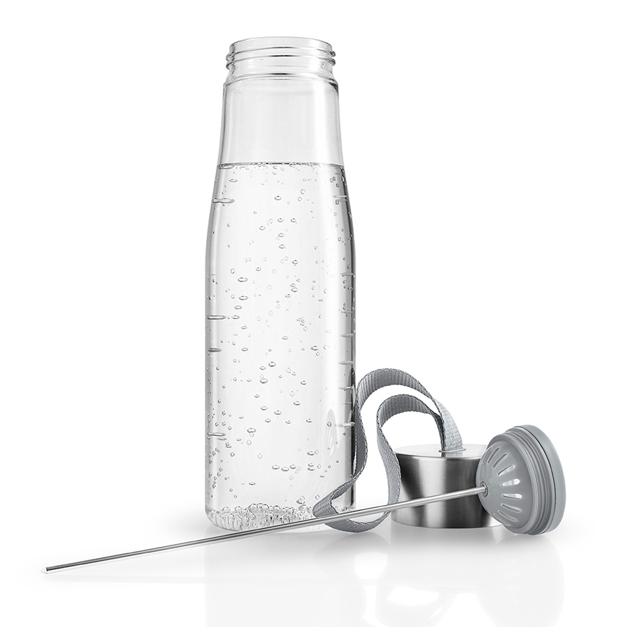 Бутылка для воды — это стильный и современный аксессуар для всех, кто следит за своим здоровьем. Дизайнеры бренда Eva Solo создали оригинальное дополнение к классической модели бутылки — съёмную шпажку для фруктов, которая крепится к крышке. Освежите воду кусочками свежих ананасов, клубники, огурцов или дольками цитрусовых или имбиря, такой напиток зарядит бодростью в течение дня. Бутылка прекрасно подойдет для прогулок пешком или на велосипеде, а также для занятий спортом. Благодаря тканевому ремешку её удобно носить в руках. Герметично закрывающаяся крышка не позволяет жидкости разлиться, если бутылка находится в сумке или рюкзаке. Модель выполнена из качественного ударопрочного пластика, в составе которого отсутствуют вредоносные примеси, такие как фталаты и бисфенол-А. Бутылка подходит для мытья в посудомоечной машине, крышку рекомендуется мыть вручную. Объём 750 мл.