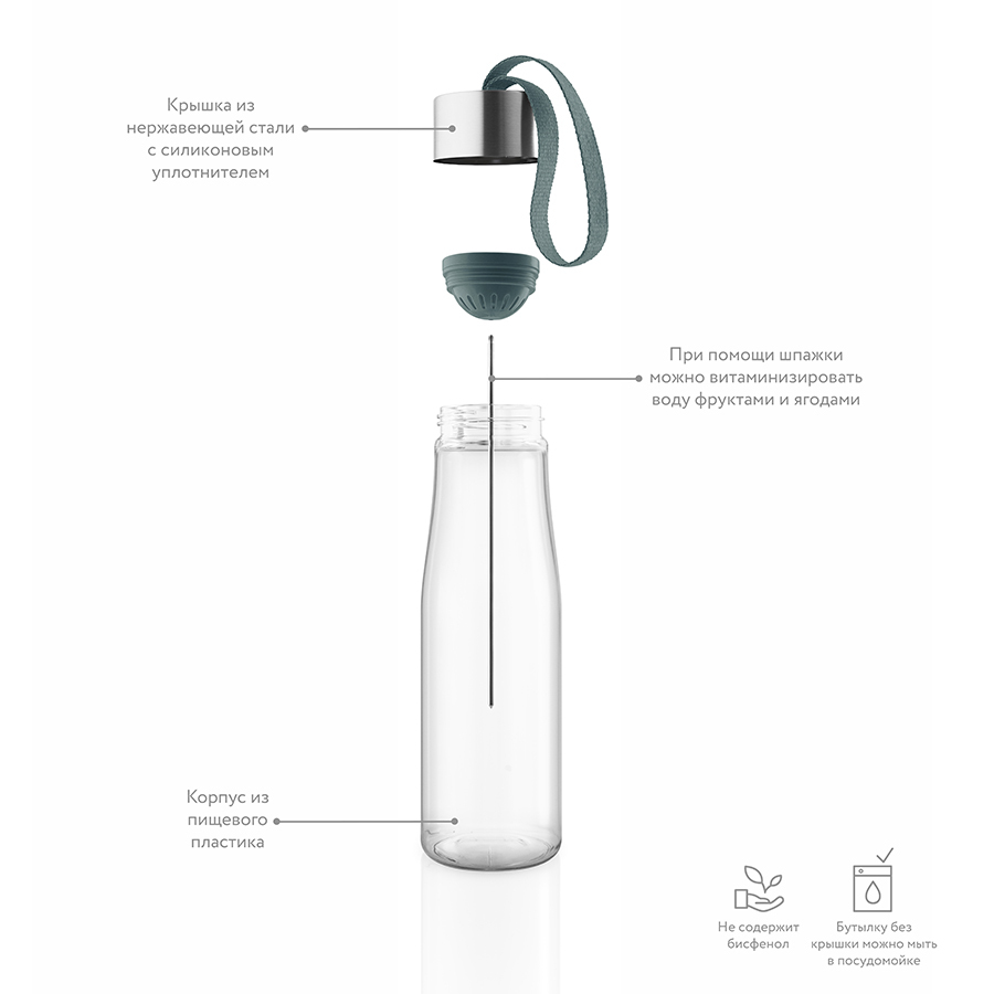 Бутылка подходит для мытья в посудомоечной машине, крышку рекомендуется мыть вручную.