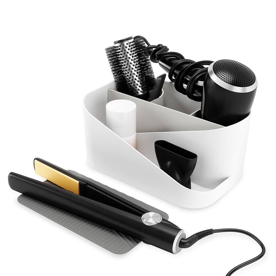 Несколько отделений позволяют организованно размещать предметы разных размеров. В набор входит силиконовый термостойкий коврик для горячих плоек и утюжков. Компактный органайзер не занимает много места в ванной или на туалетном столике.