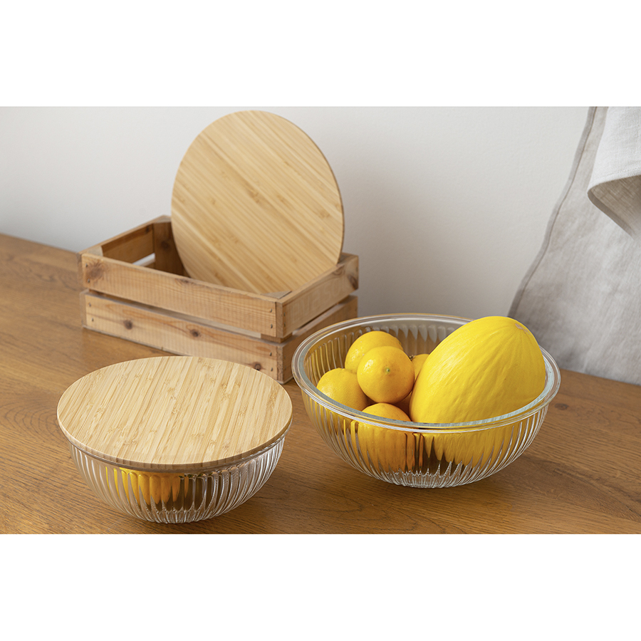 Сочетание стекла и бамбука делает посуду стильной, удобной в использовании, практичной и долговечной. Боросиликатное стекло отличается повышенной прочностью и прозрачностью, устойчиво к перепадам температуры и механическим воздействиям. Это позволяет смело нагревать и замораживать емкость, не боясь ее повредить. Крышка из бамбука обеспечивает плотное закрывание благодаря специальному ободку из силикона. Рельефный узор придает дизайну особый шарм и элегантность.