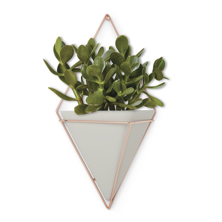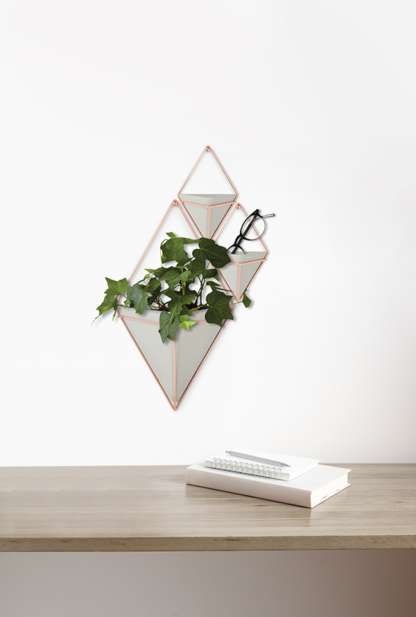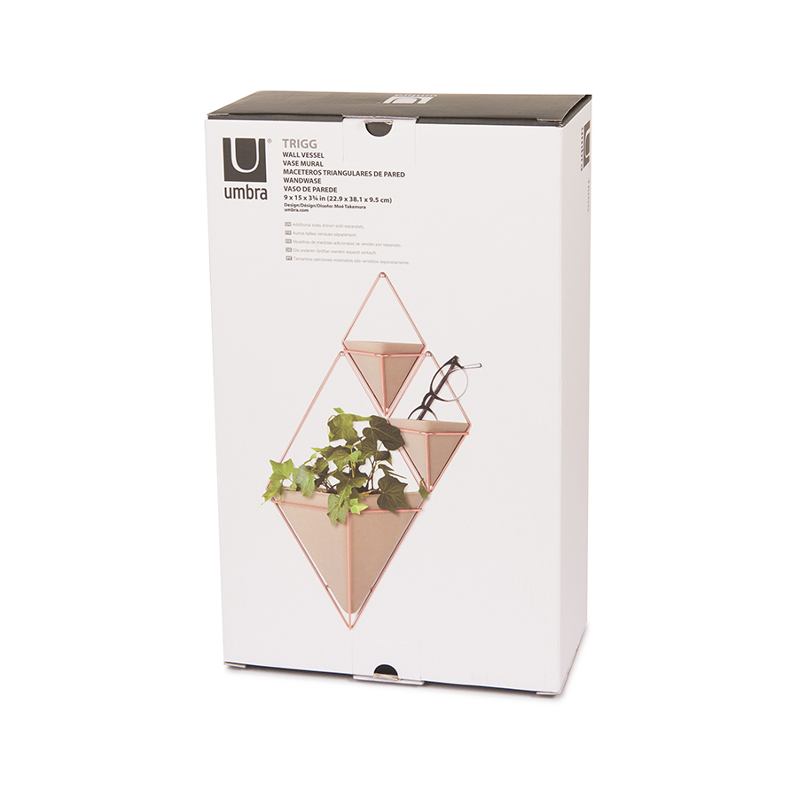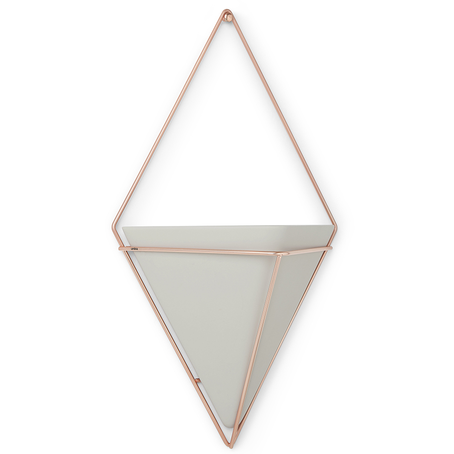 Стильный и функциональный настенный декор со строгими геометрическими формами. Представляет собой треугольное кашпо из бетона в медном ромбовидном обрамлении. Может быть использован для выращивания цветов или как подставка для мелочей. Крепится к стене или к вешалке. Две или более вазы могут формировать геометрические узорные композиции. Дизайн: Mo? Takemura