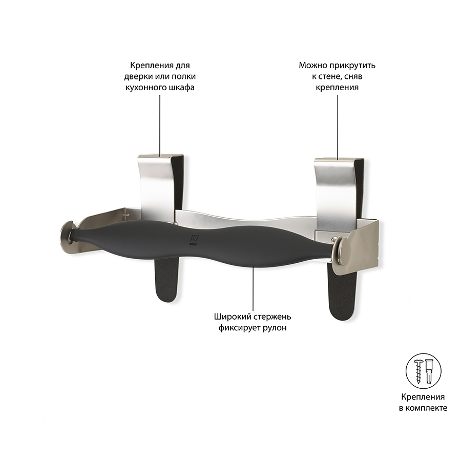 Металлический держатель для полотенец от торговой марки Umbra. Удобное крепление – зажим, позволит Вам удобно зафиксировать держатель на стену, на дверцу или на кухонный шкафчик , благодаря этому, они не будут занимать столь ценное место на столе и мешать заниматься приготовлением пищи.