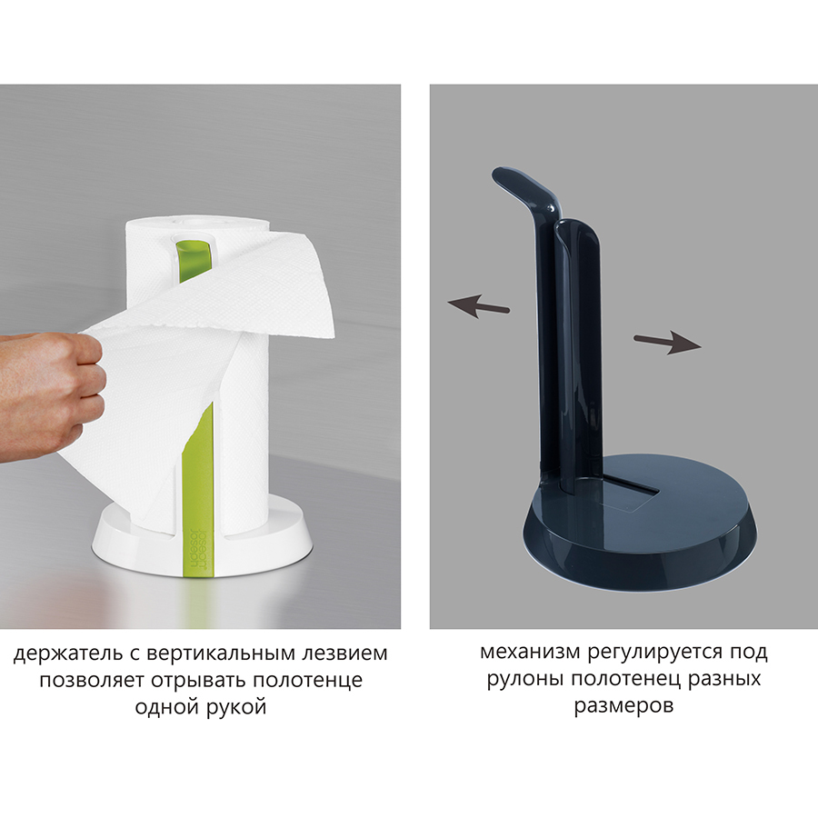Держатель с вертикальным лезвием позволяет отрывать бумажные полотенца одной рукой. Утяжелённая подставка с нескользящим основанием обеспечивает устойчивую поддержку — держатель не падает и не скользит, даже если с силой потянуть за полотенца. Механизм регулируется под салфетки самых разных размеров. Рулон всегда остается прочно зафиксированным на месте — неважно, сколько полотенец на нем осталось. Лезвие для отрывания сверху оснащено удобной ручкой, так что держатель очень удобно переносить с места на место. Рекомендуется чистить вручную влажной тканью.