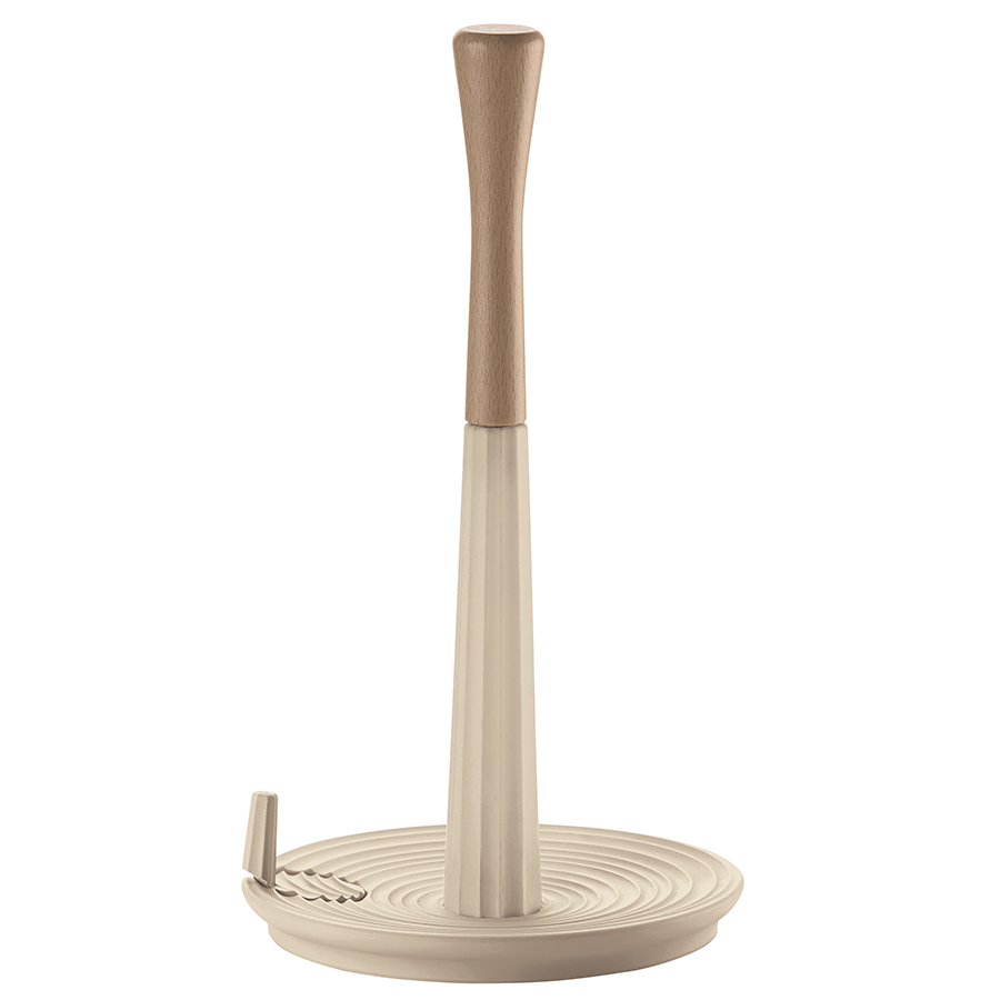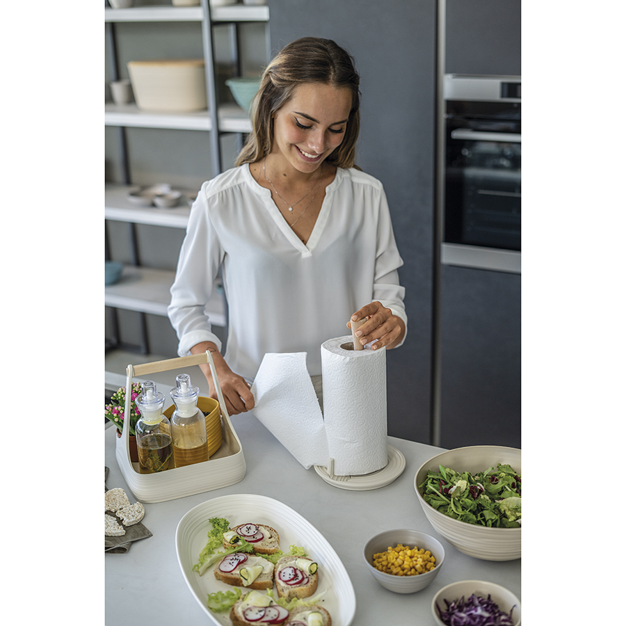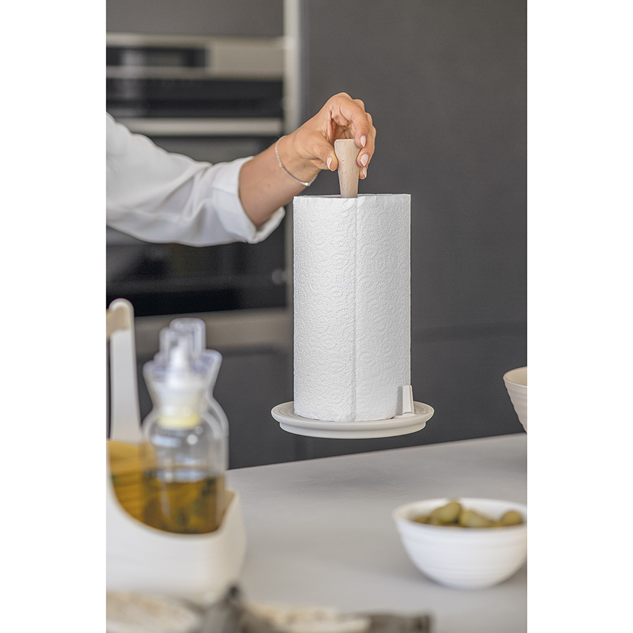 Держатель для бумажных полотенец выполнен из переработанного пластика и дерева. Дизайн изделия напоминает керамику, а реалистичности внешнему виду придают тщательно подобранные пастельные тона и неровные круговые узоры, создающие эффект ручной работы.