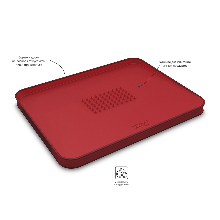 Двусторонняя мультифункциональная разделочная доска. Одна из сторон доски оснащена специальными зубцами для плотной фиксации мяса. Благодаря небольшому наклону и бортикам по краям, вся лишняя жидкость и кусочки продуктов аккуратно собираются и не пачкают поверхность стола. С обратной стороны доска предоставляет гладкую поверхность для нарезания любых продуктов. Обе стороны располагают нескользящими краями и удобными для придерживания стенками. Можно мыть в посудомоечной машине.